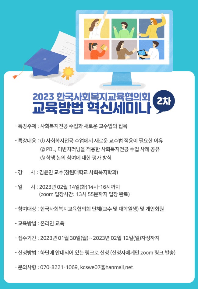 (사)한국사회복지교육협의회에서 '2023 한국사회복지교육협의회 교육방법 혁신 세미나'를 진행합니다.