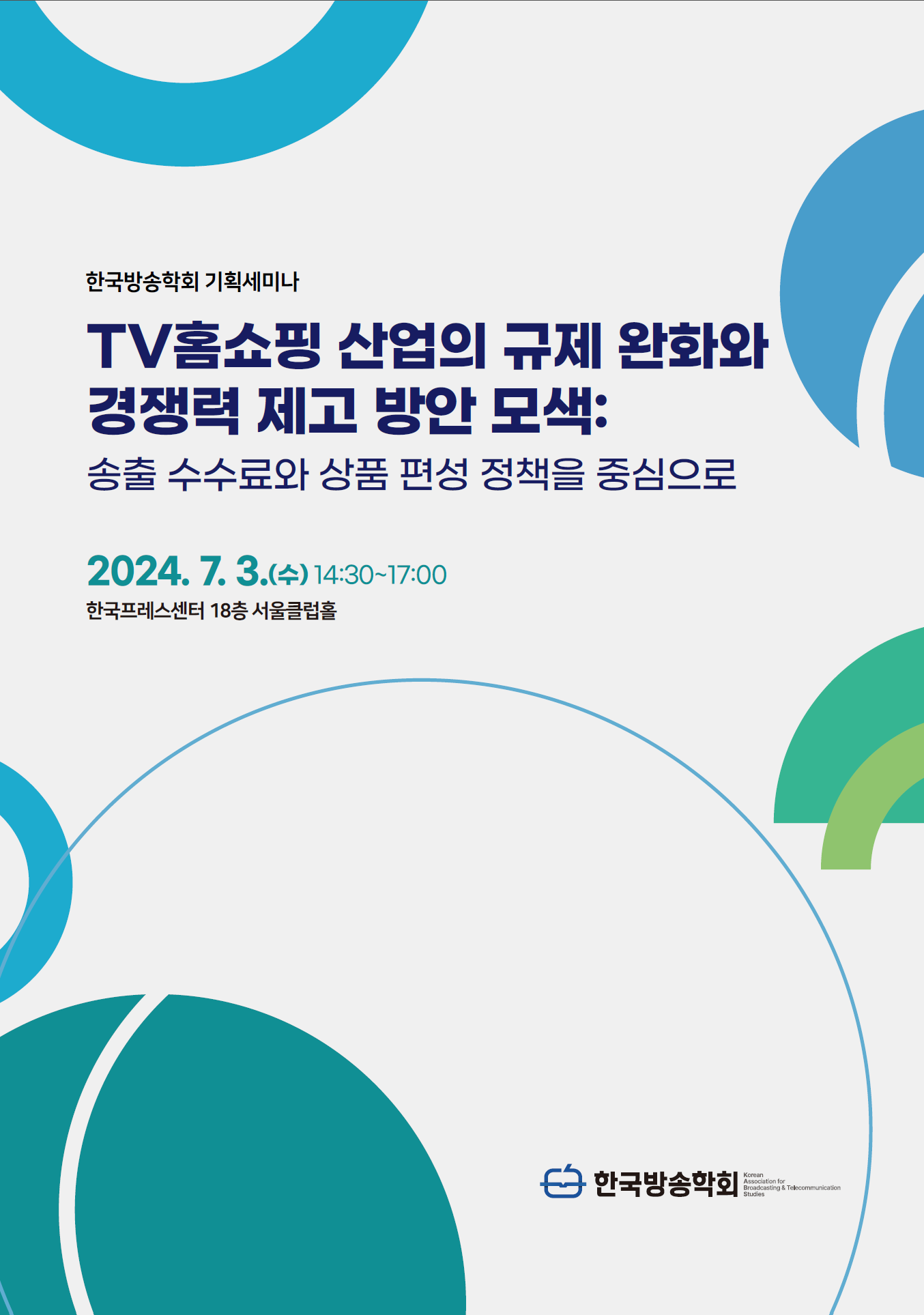 한국방송학회(학회장 전범수, 한양대 교수)는 오는 3() 1430분부터 한국프레스센터 18층 서울클럽홀에서 <TV홈쇼핑 산업의 규제 완화와 경쟁력 제고 방안 모색: 송출 수수료와 상품 편성 정책을 중심으로>라는 주제로 기획세미나를 개최한다.