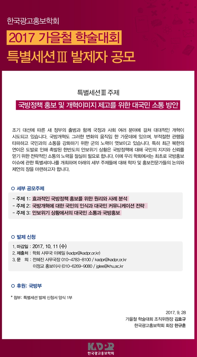[KADPR] 2017 가을철 학술대회 발제자 공모 <특별세션 Ⅲ: 국방부 후원>