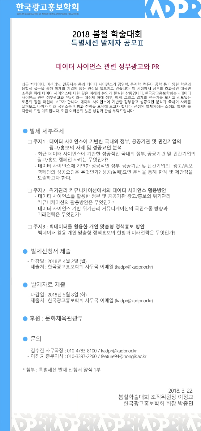 [KADPR] 2018 봄철학술대회 특별세션 Ⅱ 발제자 공모 (데이터 사이언스 관련 정부광고와 PR)