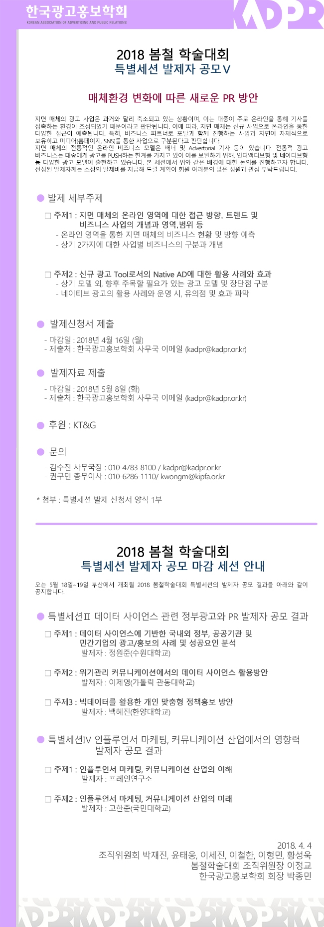 [KADPR] 2018 봄철학술대회 특별세션 Ⅳ 발제자 공모 (광고·미디어·콘텐츠 육성을 위한 공적 데이터 거버넌스/인플루언서 마케팅, 커뮤니케이션 산업에서의 영향력/미디어 변혁의 시대, 진일보한 광고홍보효과측정 방안의 모색)