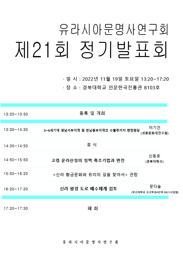 2022년 11월 19일 토요일, 유라시아문명사연구회 제21회 정기발표회가 진행될 예정입니다.