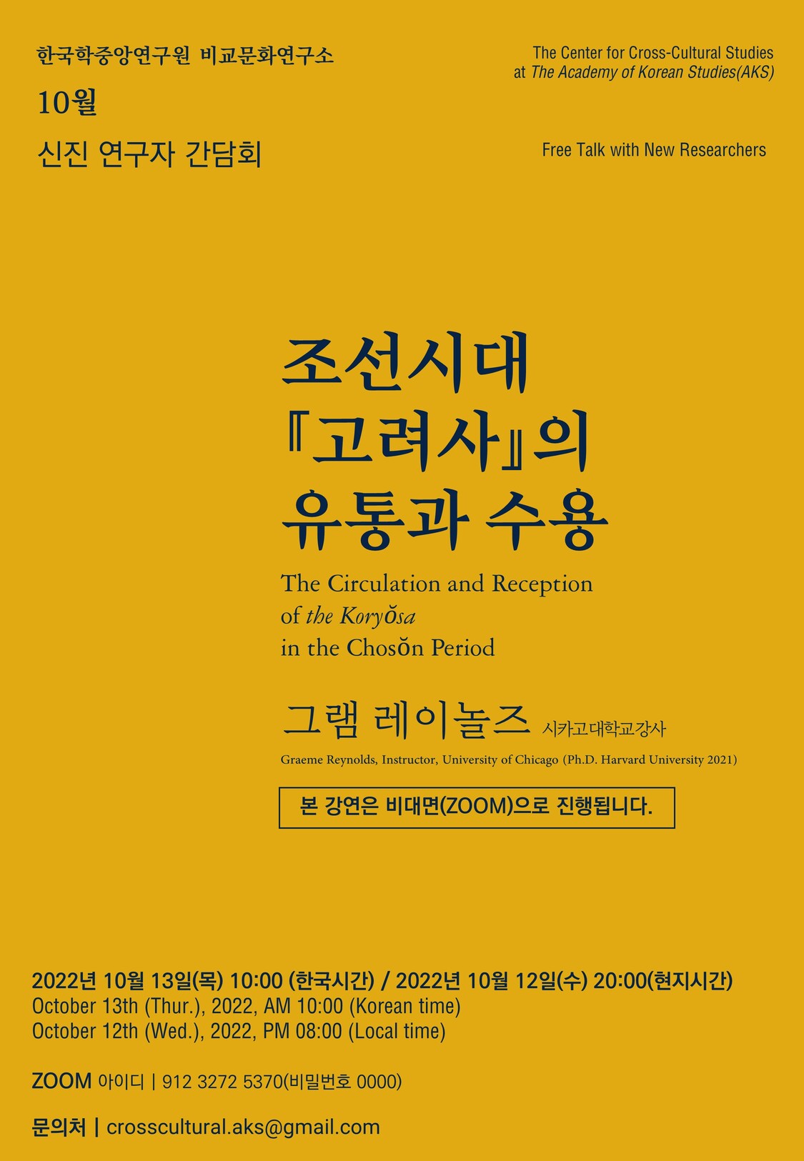 한국학중앙연구원 비교문화연구소 2022년 <신진연구자간담회> 시리즈 5회 콜로키움 개최 안내