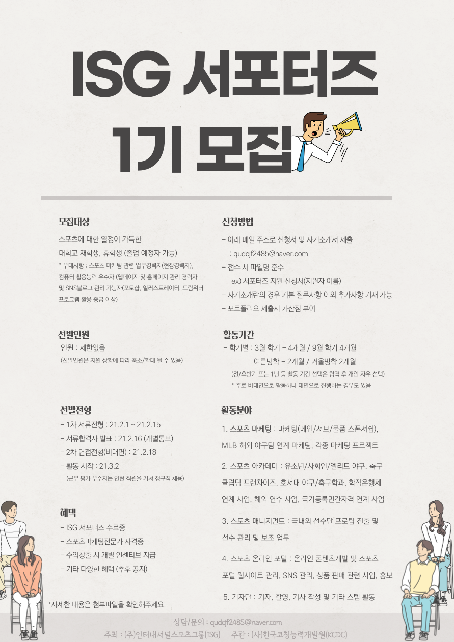 본 ISG가 주최하고 KCDC가 주관하는 ''''ISG 서포터즈 공식 1기(ISG스포츠객원마케터18기)''''모집이 시작되었습니다여러분들의 많은 관심 부탁드립니다.