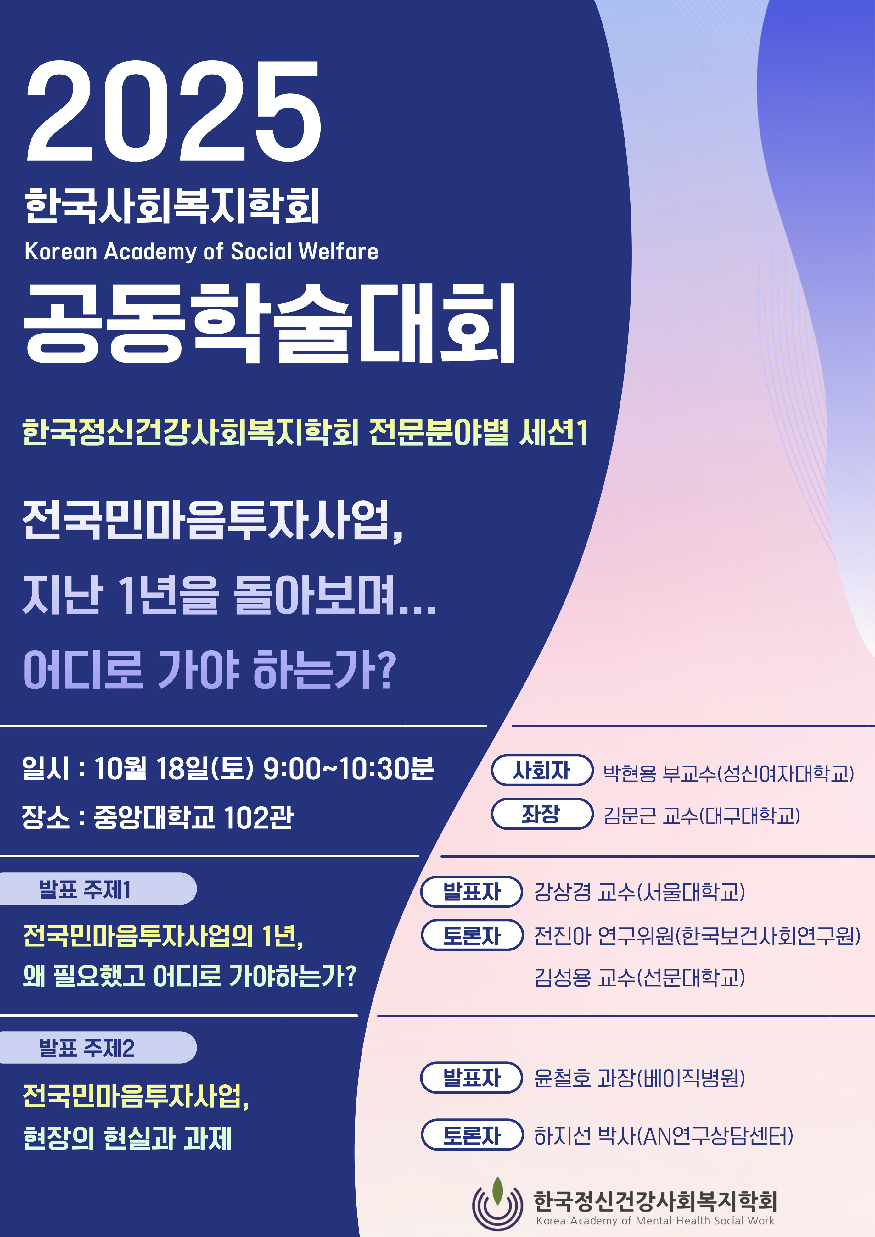우리 학회는 10월 18일(토) 오전 9:00~10:30에 "전국민마음투자사업, 지난 1년을 돌아보며... 어디로 가야하는가?" 라는 주제로