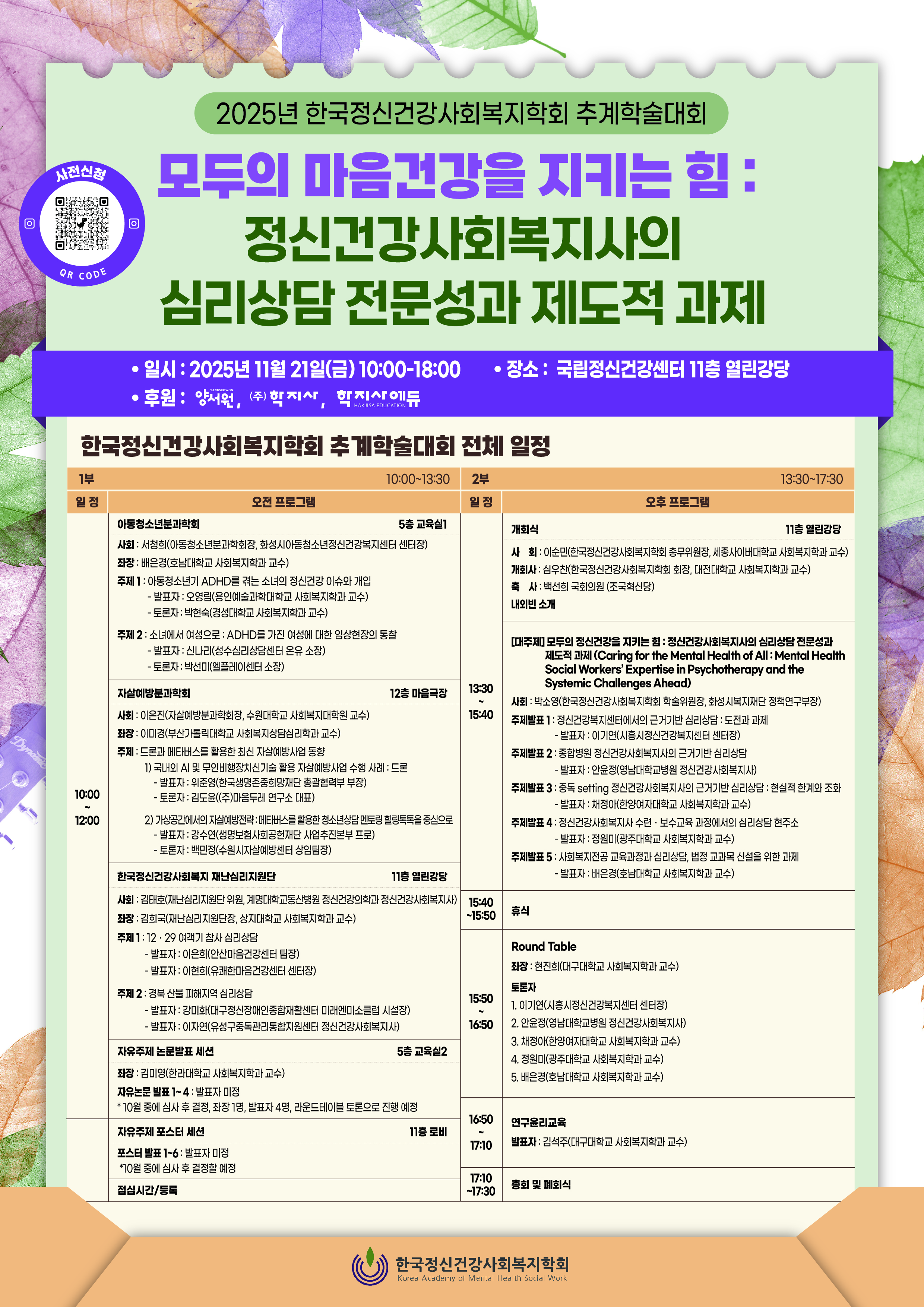 - 주제 : 모두의 마음건강을 지키는 힘: 정신건강사회복지사의 심리상담 전문성과 제도적 과제