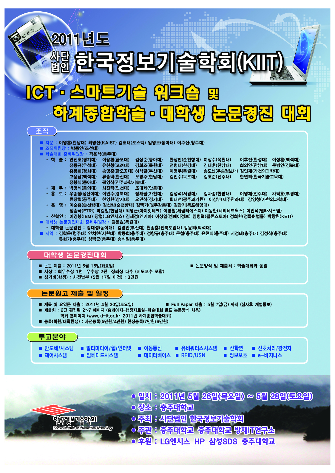 일시 : 2011년 5월 26일 ~ 28일 장소 : 충주대학교 주최 : 사단법인 한국정보기술학회 주관 : 충주대학교 충주대학교 방재IT연구소 후원 : LG엔시스 HP 삼성SDS 충주대학교
