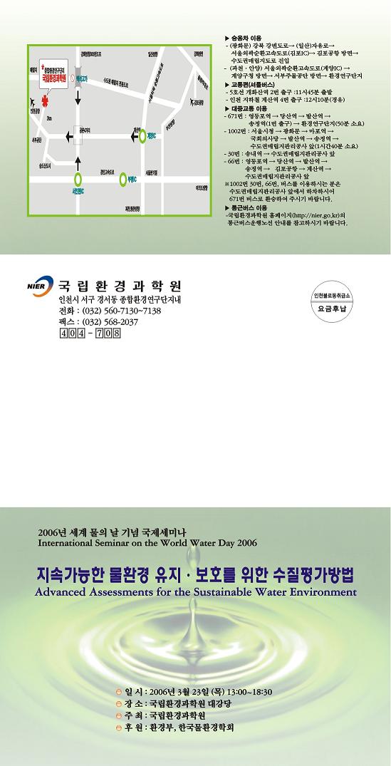 우리 과학원에서는 2006년 세계 물의 날을 기념하여 『지속가능한 물환경 유지.보호를 위한 수질평가방법』이라는 주제로 국내.외 전문가를 모시고 붙임과 같이 국제 세미나를 개최하오니 귀 학회의 홈페이지에 공지하여 회원님들이 많이 참석할 수 있도록 협조하여 주시기 바랍니다.