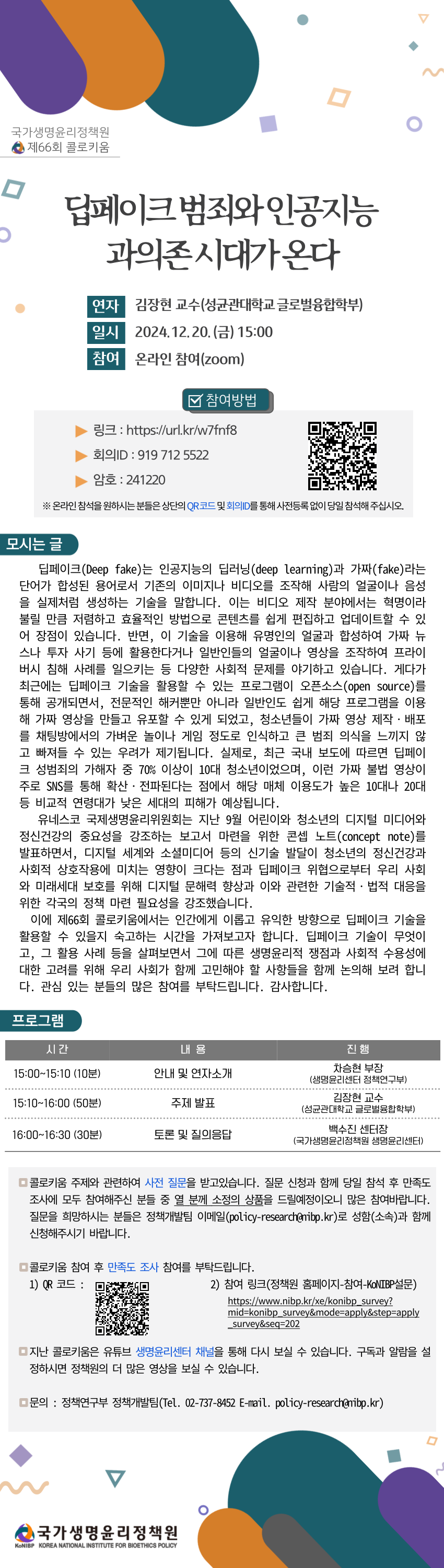 국가생명윤리정책원에서 12월 20일 금요일 15시에 제66회 콜로키움「딥페이크 범죄와 인공지능 과의존 시대가 온다」를 개최합니다. 사전등록 없이 당일 바로 참여하실 수 있으며 사전 질문을 신청하실 수 있습니다. 사전 질문 신청과 함께 당일 강연 참석 후 만족도조사에 참여하신 분들 중 열 분을 선정하여 소정의 상품도 드릴 예정이오니 많은 참여를 부탁드립니다.