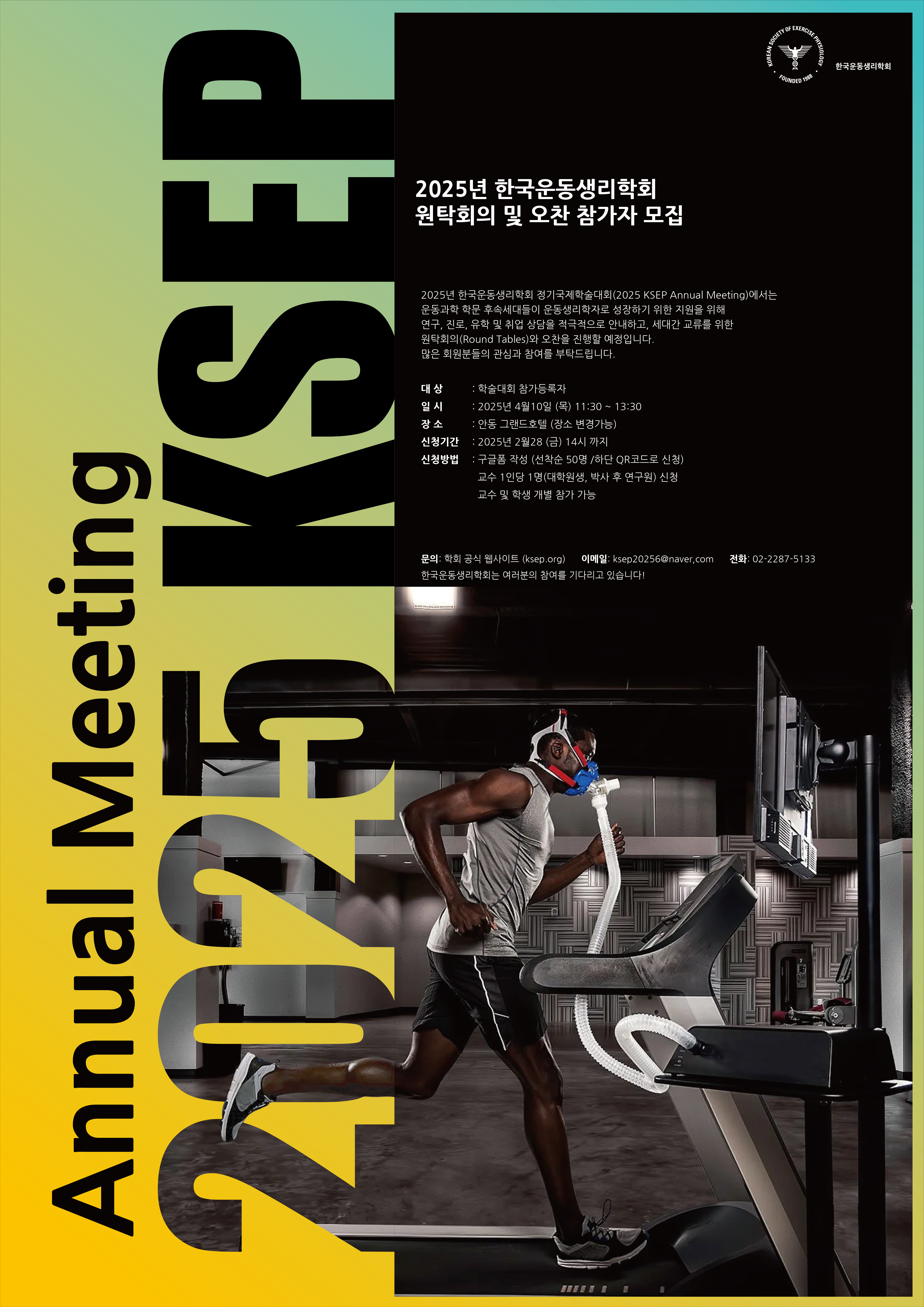 2025년 한국운동생리학회 정기국제학술대회 (2025 KSEP Annual Meeting)에서는 운동과학 학문 후속세대들이 운동생리학자로 성장하기 위한 지원을 위해 연구, 진로, 유학 및 취업 상담을 적극적으로 안내하고, 세대간 교류를 위한 원탁회의(Round Tables)와 오찬을 진행할 예정입니다.