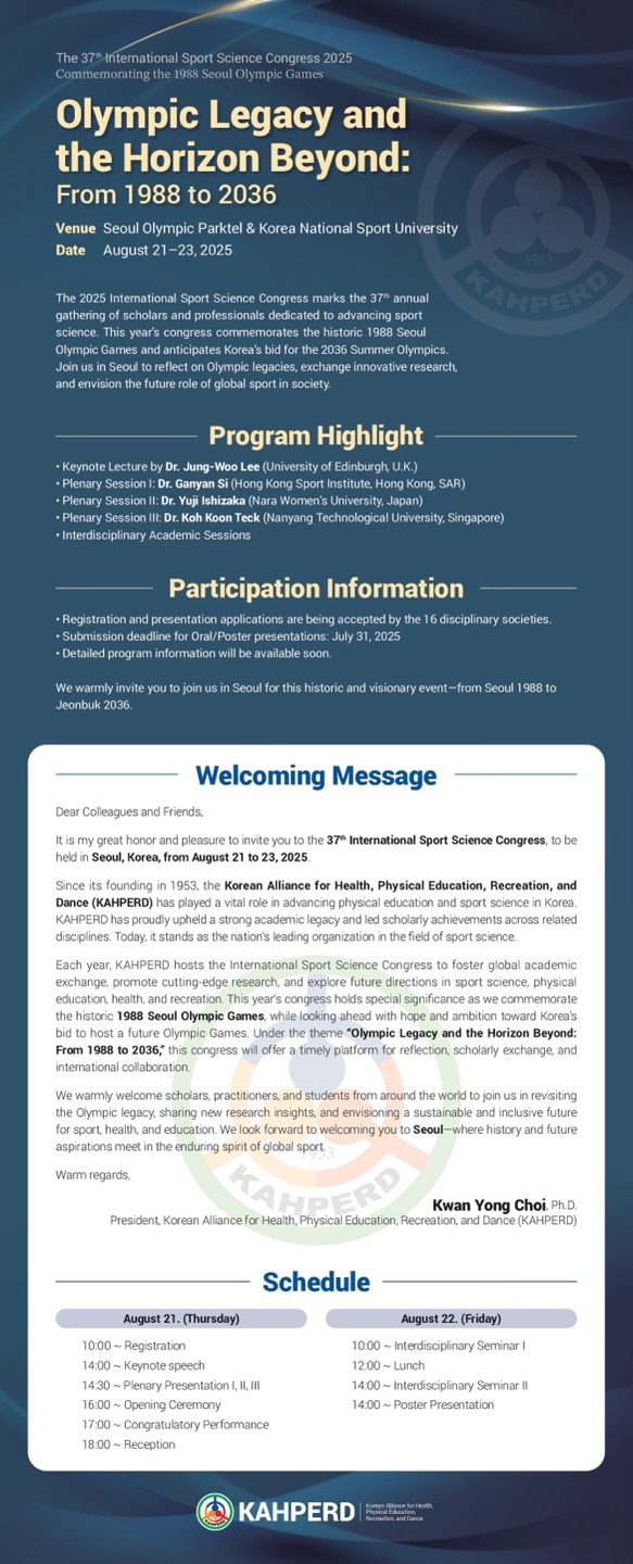 제37회 88서울올림픽기념국제학술대회 한국운동생리학회 분과 Oral Presentation 및 Poster Session 일정을 아래와 같이 안내드립니다.