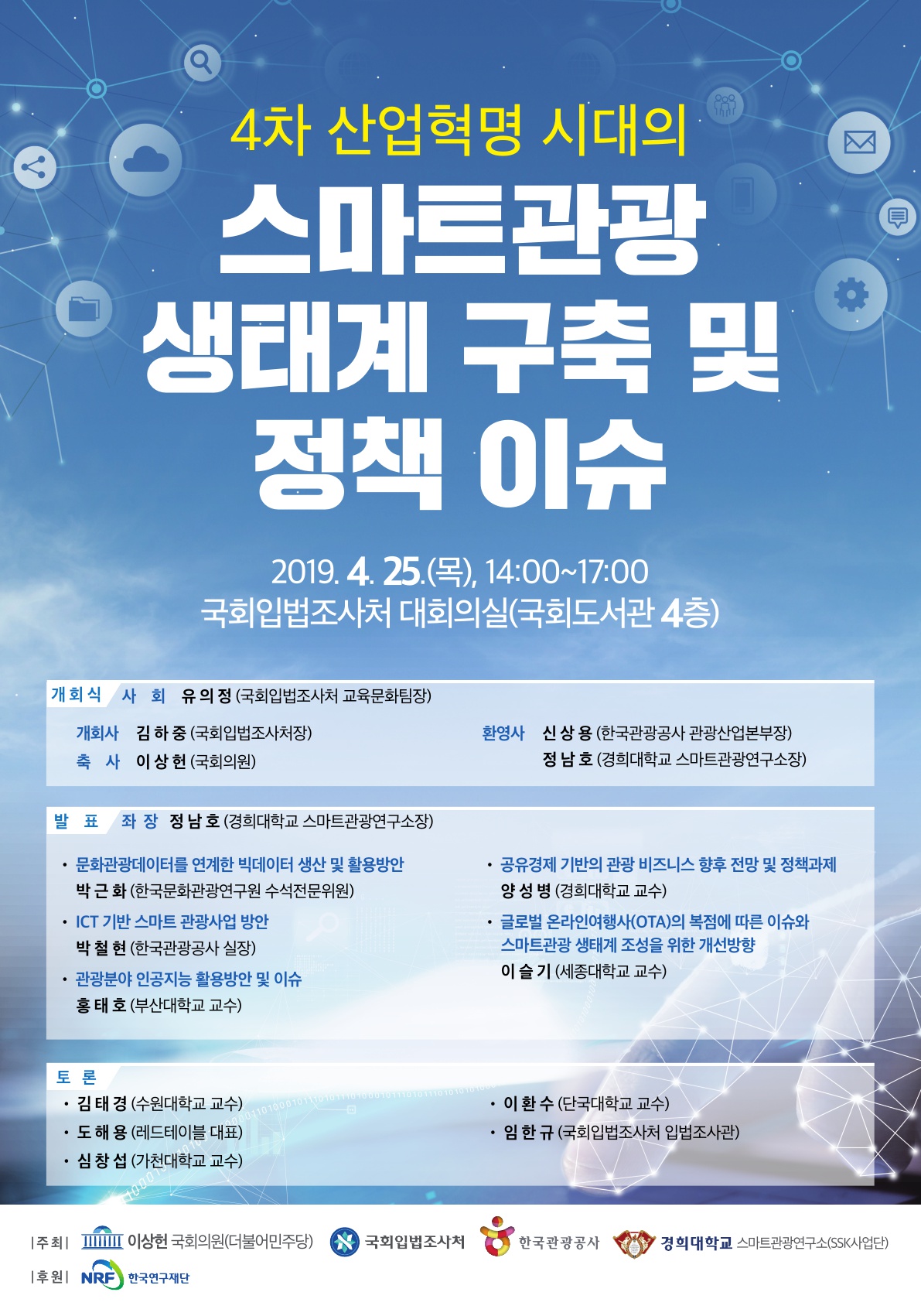 2019년 4월 25일 14:00-17:00, 국회입법조사처에서 이상헌국회의원(더불어민주당), 국회입법조사처, 한국관광공사, 경희대학교스마트관광연구소 공동 주체로 4차 산업혁명 시대의 스마트관광 생태계 구축 및 정책 이슈라는 주제로 행사가 있으니 관심있으신 분들의 참여를 부탁드립니다.