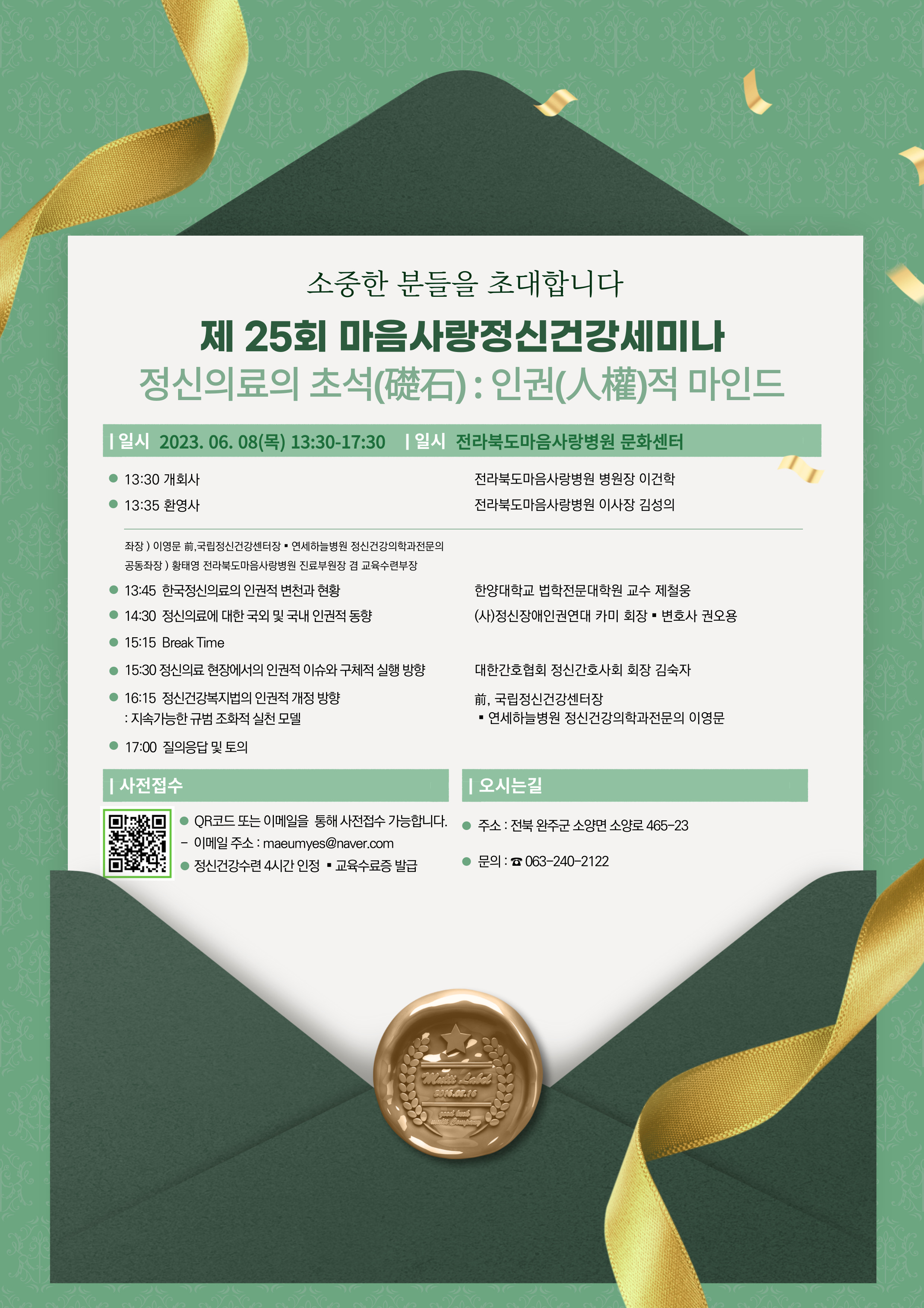 제25회 마음사랑정신건강세미나 개최 안내-정신의료의 초석: 인권적 마인드