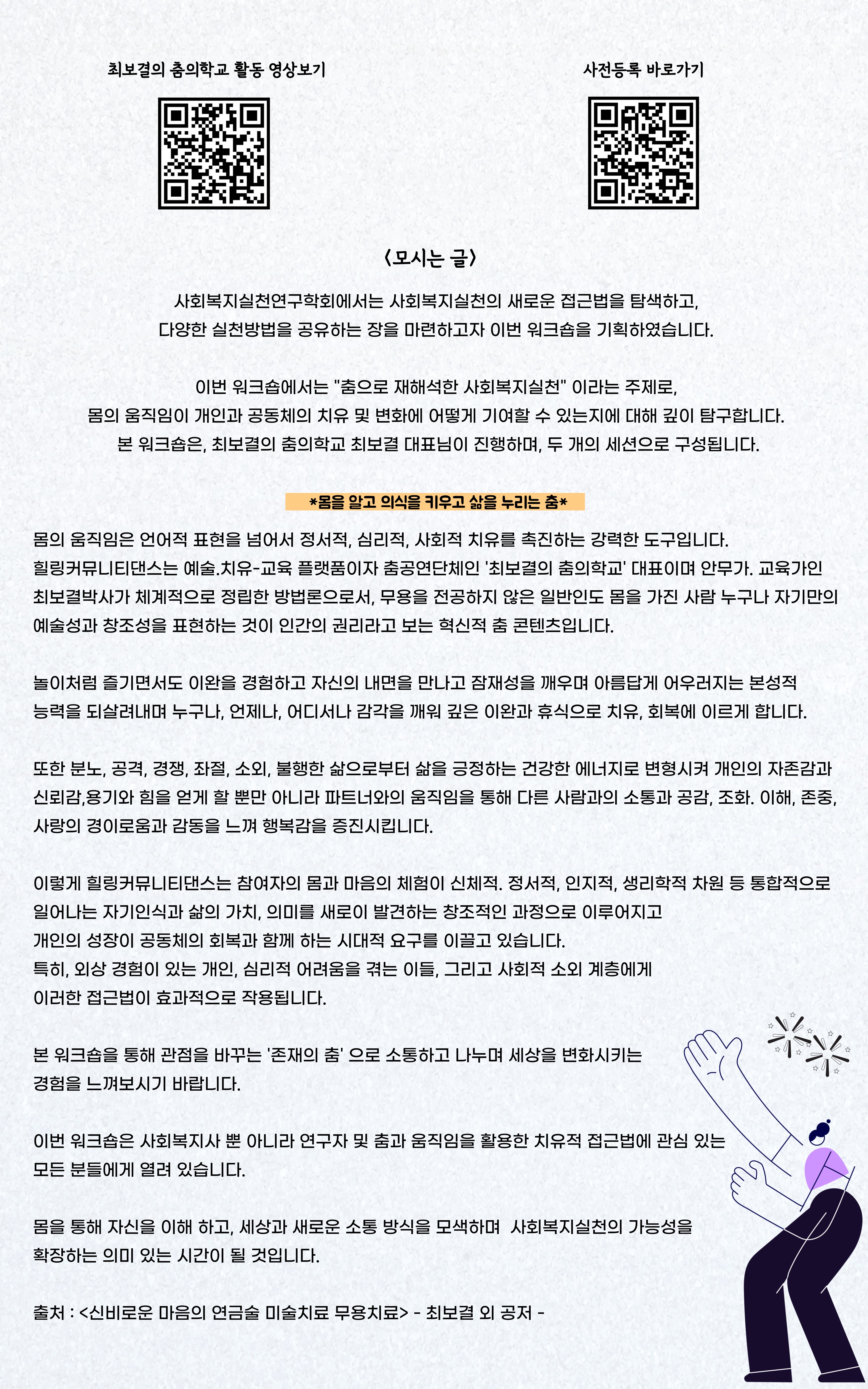 본 학회에서는 5월 30일 춤으로 재해석한 사회복지실천 “쓸수록 커지는 유연한 힘” 이라는 주제로 춘계워크숍을 개최 예정입니다.