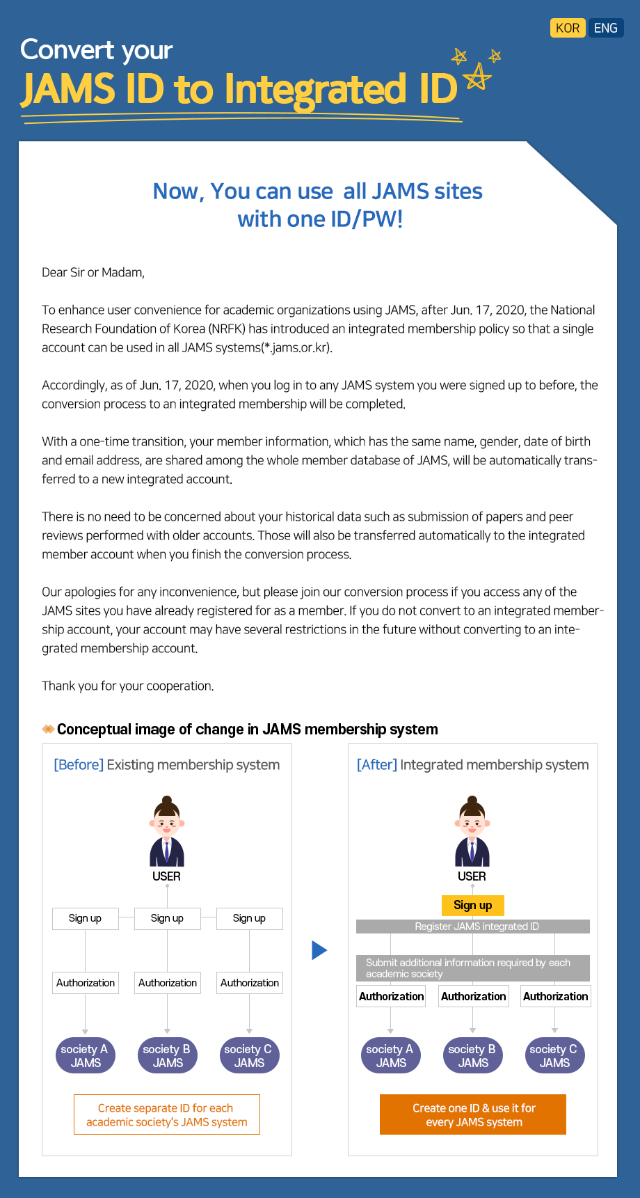 앞으로 하나의 계정(ID/PW)으로 모든 JAMS 시스템에 로그인하실 수 있도록 통합회원 제도를 도입하려 합니다.