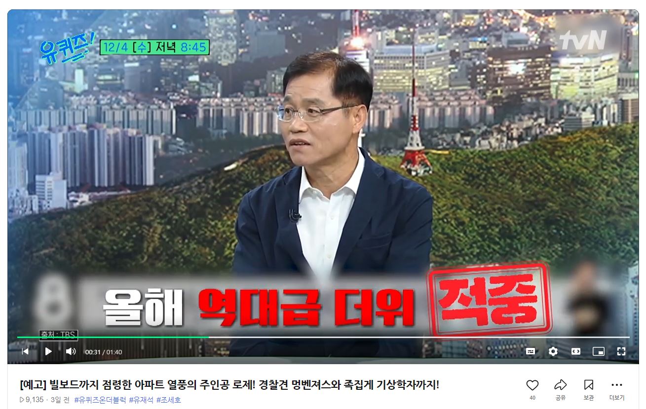 < tvn 유 퀴즈 온 더 블럭 > 에   "족집게 기상학자" 로 출연하심을 알려드립니다.