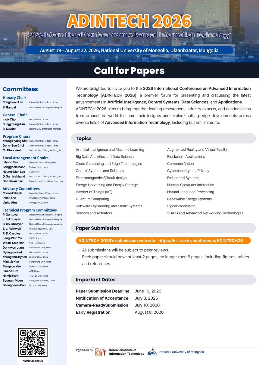 We are pleased to announce the International Conference on Advanced Information Technology (ADINTECH 2026), to be held from August 19–22, 2026, at the National University of Mongolia, Ulaanbaatar, Mongolia.