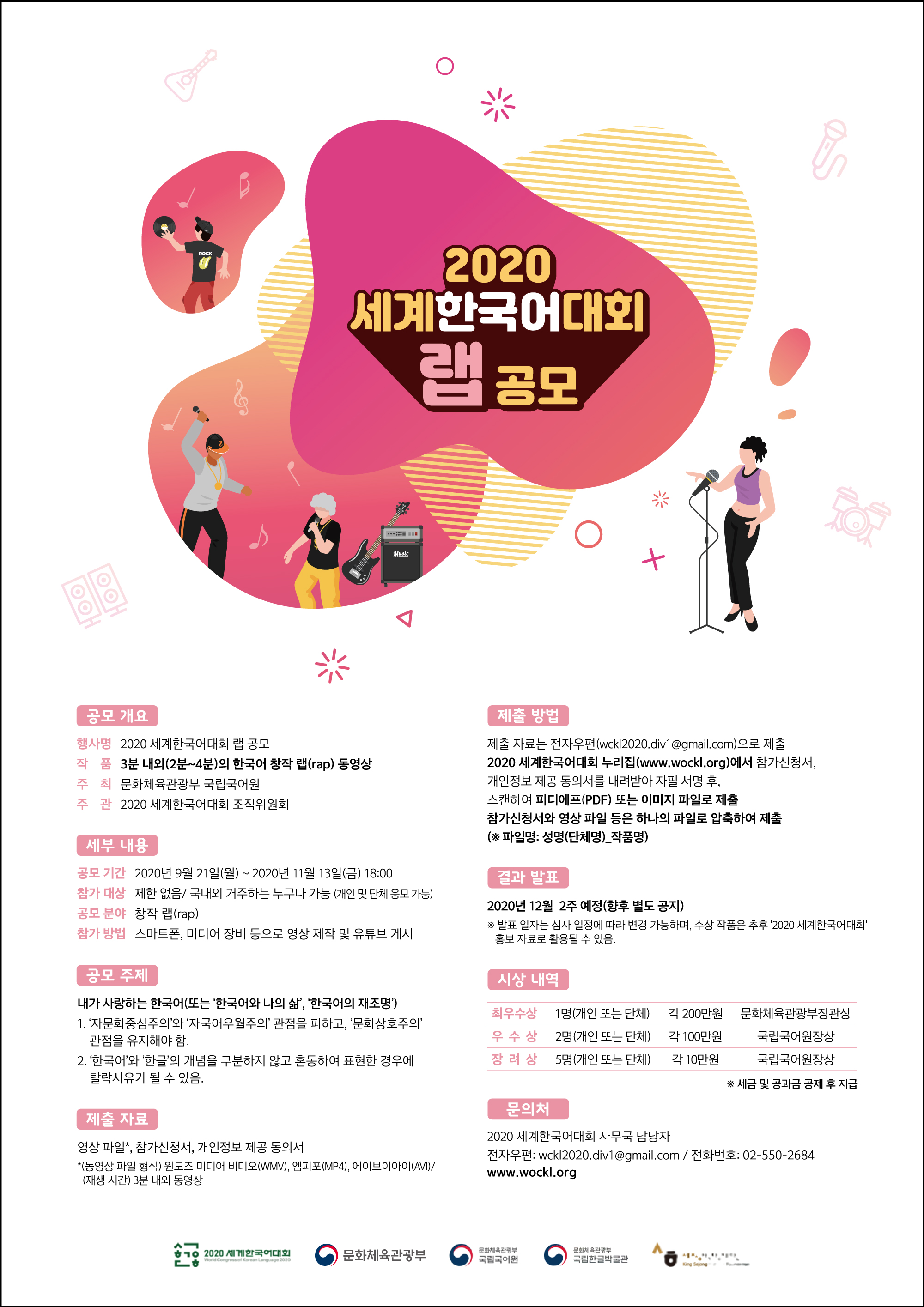 한국어에 대한 관심과 흥미를 확산하고 새로운 음악 문화 확산 및 한국어 활용의 다양성을 널리 알리는 기회를 마련하고자 『2020 세계한국어대회 랩 공모』를 진행합니다. 한국어·한국 문화를 사랑하고 재능과 열정을 가진 국내외 누구나 참여할 수 있으니 여러분의 많은 참여를 바랍니다.