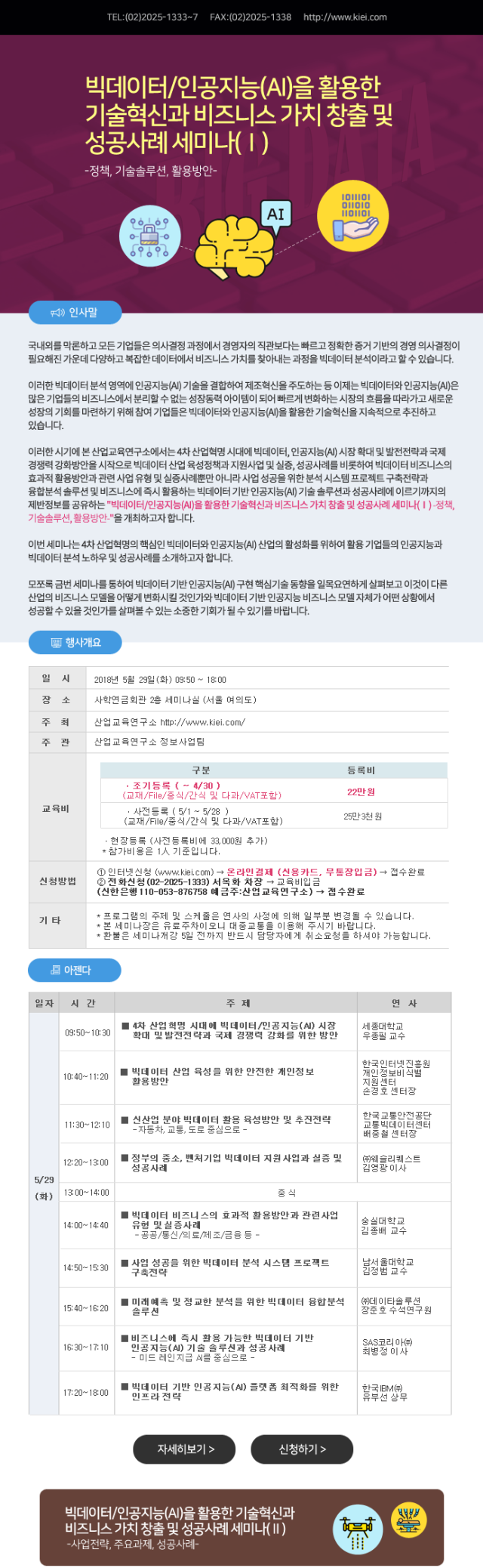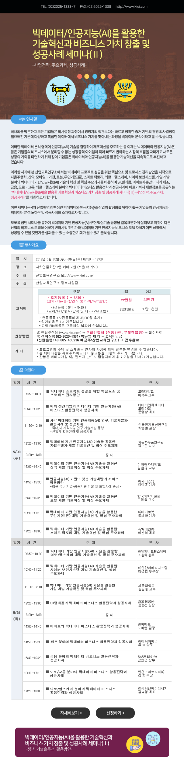2018년 5월 산업교육연구소에서 주최하는 2건의 세미나(빅데이터Ⅰ,Ⅱ) 일정 안내드립니다.