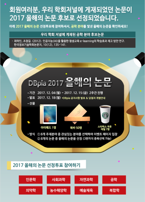 한국정보기술학회 논문이 DBpia 2017 올해의 논문 " 후보논문으로 선정되었습니다."