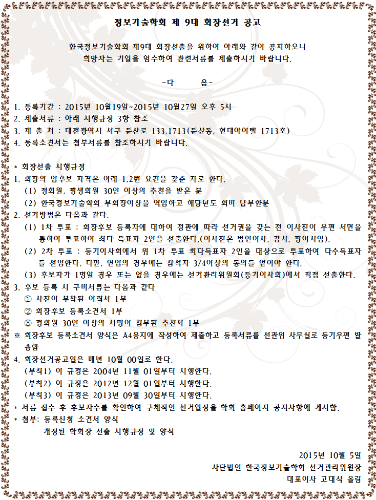 한국정보기술학회에서는 학회장 선출방법을 포함하여 정관개정을 추진하고 있으나 2016년 1월부터 개정된 정관을 적용할 예정이므로 2015년 올해는 기존의 정관과 기존의 회장선출 시행규정에 의하여 회장을 선출합니다. 법인이사회에서 개정한 학회장 선출시행규정을 첨부하였으며 이 또한 2016년 1월부터 시행할 예정이오니 미리 참고하시길 바랍니다.