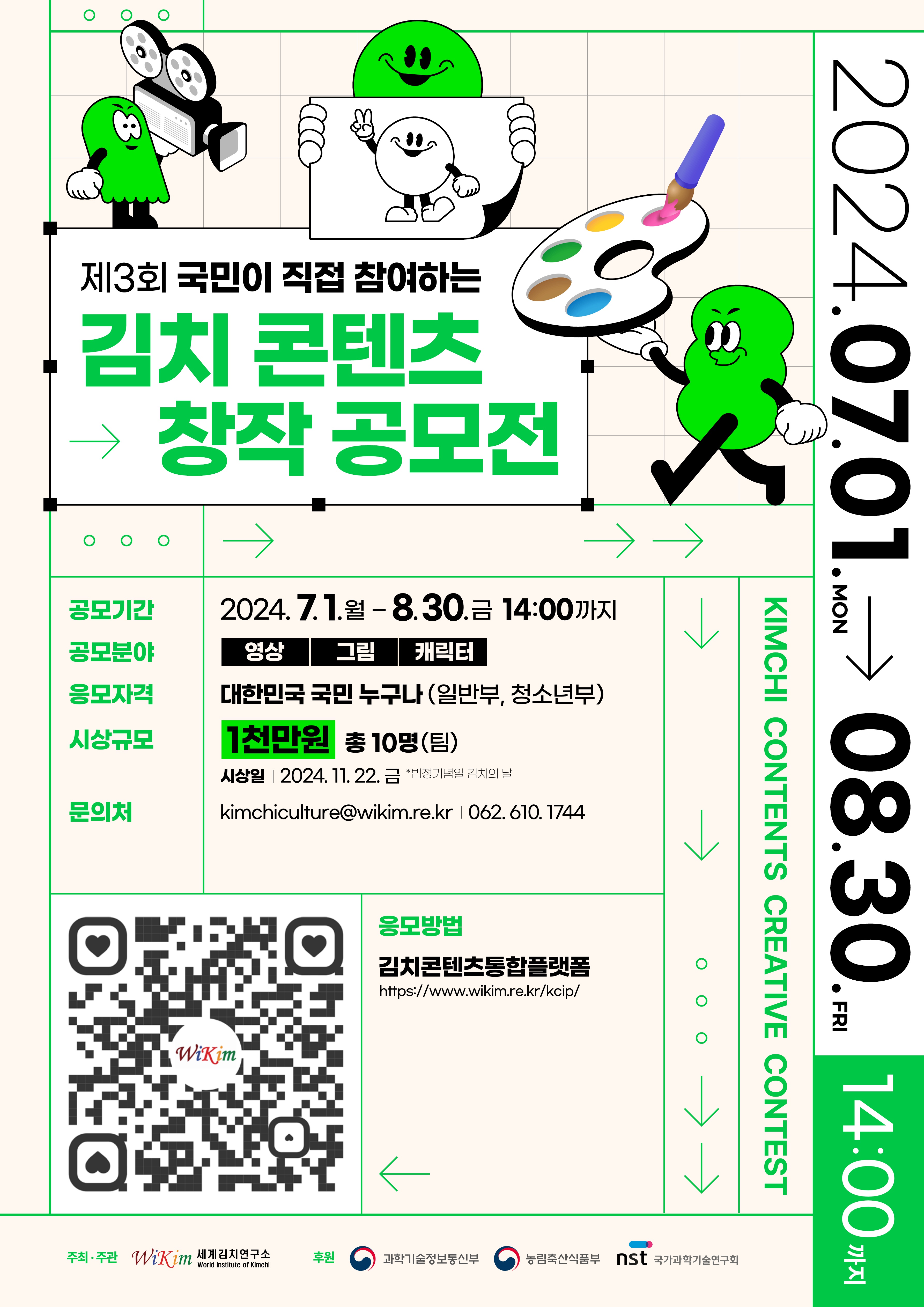 세계김치연구소는 과학기술정보통신부 산하 정부출연연구기관으로 김치 과학, 문화 자원 확보 및 김치 우수성 홍보와 가치 계승을 위해「제3회 국민이 직접 참여하는 김치 콘텐츠 창작 공모전」을 개최합니다.
