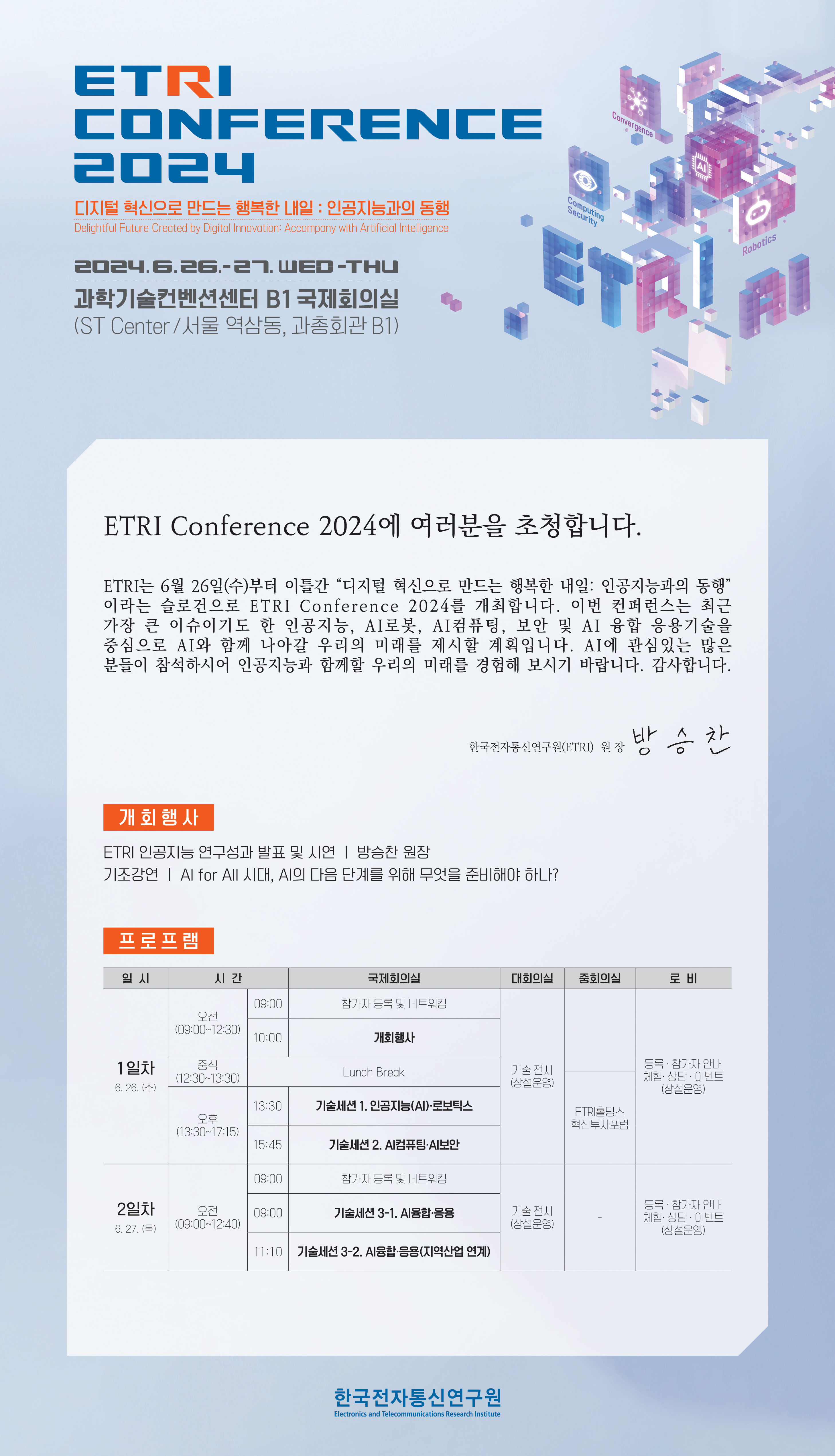 ETRI가 “디지털 혁신으로 만드는 행복한 내일: 인공지능과의 동행”을 주제로 ETRI Conference 2024를 개최합니다.