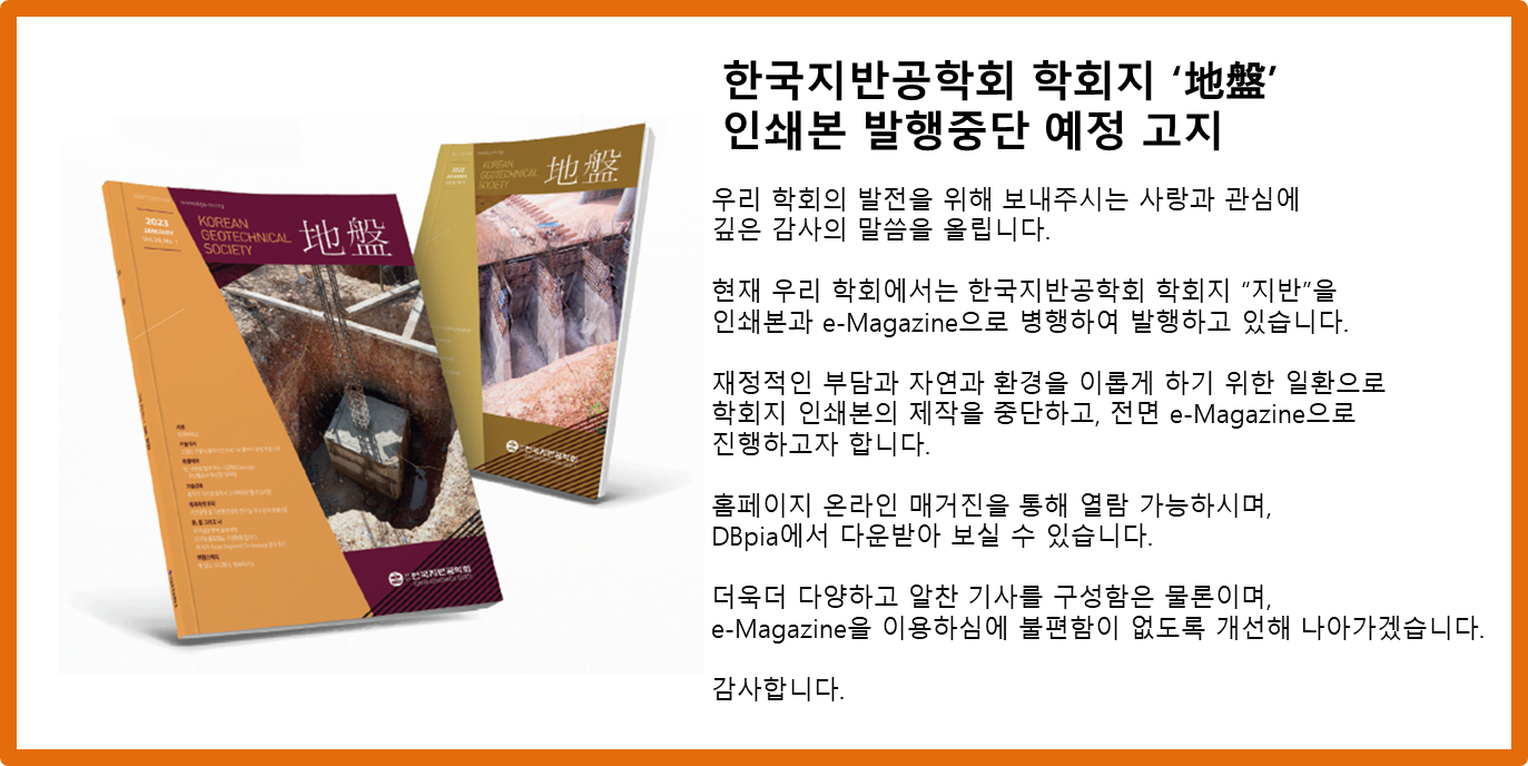 현재 우리 학회에서는 한국지반공학회 학회지 “지반”을 인쇄본 e-Magazine으로 병행하여 발행하고 있습니다.