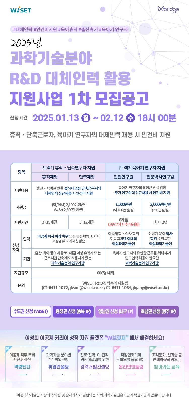 4. 문의처 : WISET R&D경력복귀지원팀, 02-6411-1072, jksim@wiset.or.kr