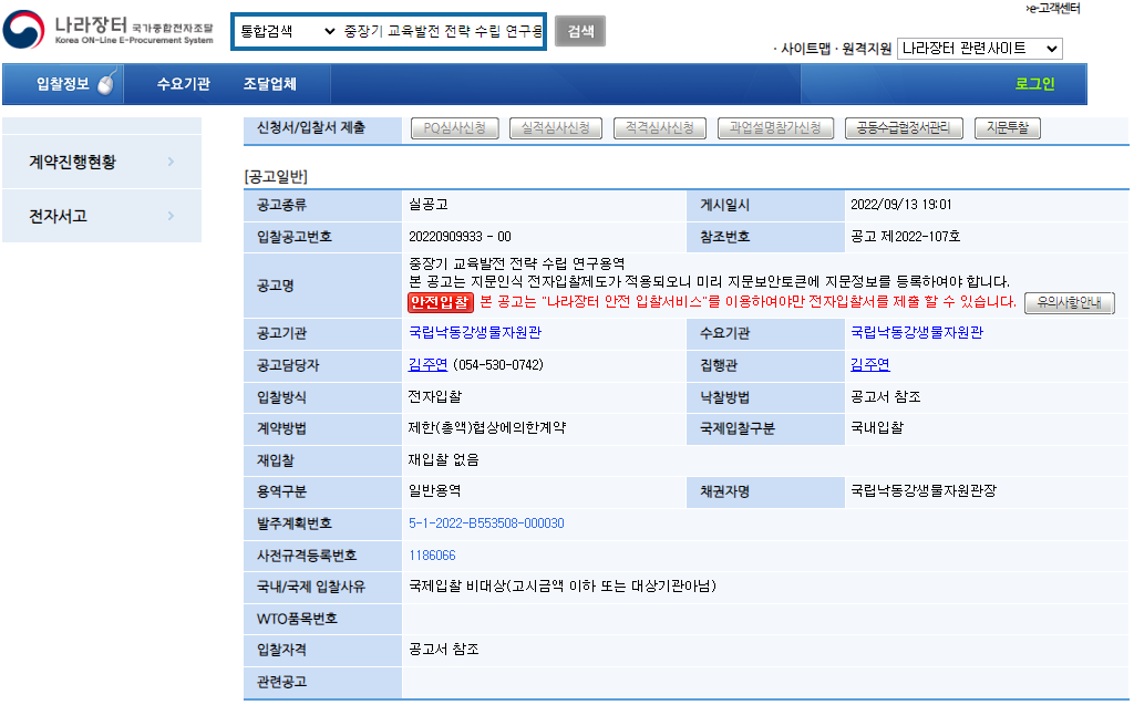 환경부 산하 공공기관인 국립낙동강생물자원관에서 환경교육관련 용역사업 공고가 진행되고 있습니다.참고하시기 바랍니다. 공고명: 중장기 교육발전 전략 수립 연구용역입찰공고번호: 20220909933 – 00 사업금액: 40,000,000원 기타: 나라장터 참고사항 첨부