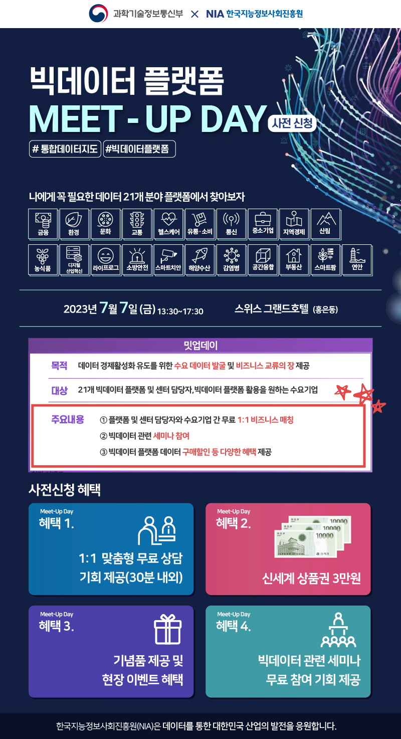 본 행사는 7월 7일(금) 서울 홍은동 스위스 그랜드호텔에서 열리며, ‘한국지능정보사회진흥원(NIA)’가 주관하고 금융, 환경 등 21개 분야 빅데이터 플랫폼 및 데이터 공급기업이 참여 예정입니다.