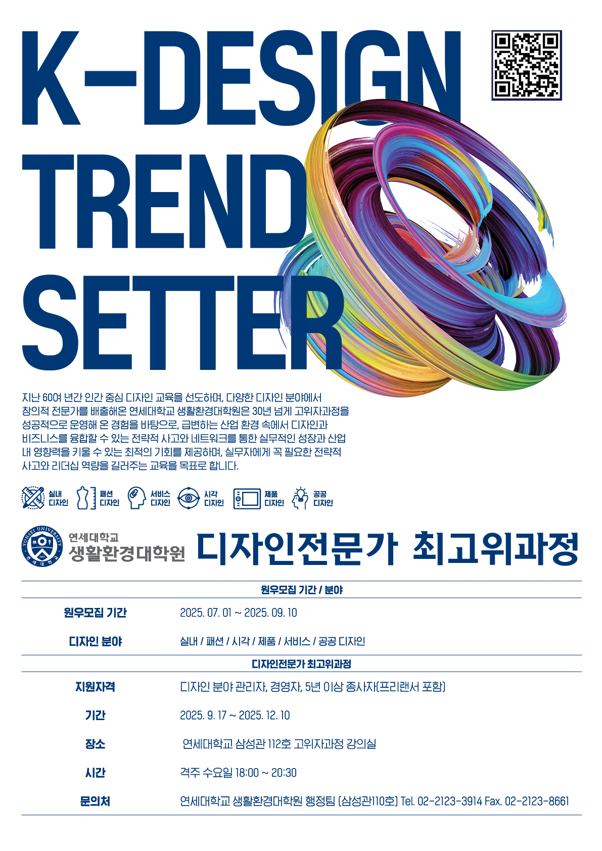 다름이 아니오라 연세대학교 생활과학대학내 생활환경대학원에서 "디자인전문가 최고위과정"을 개설하게 되어 알려드립니다.
