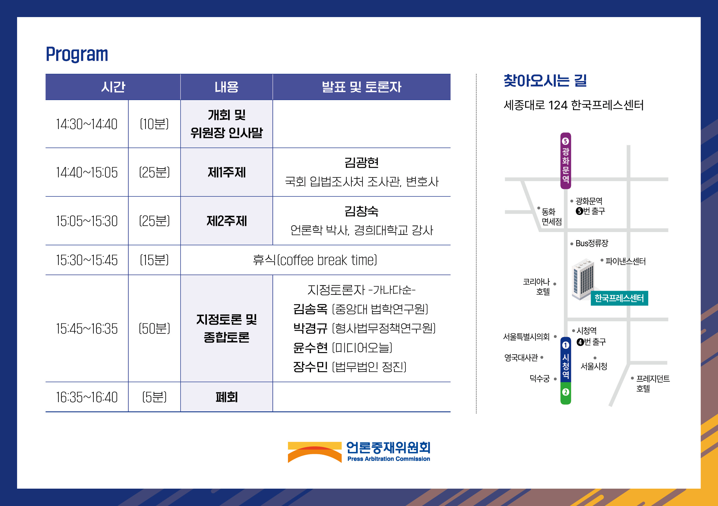 * 참석을 희망하시는 분들께서는 사전 좌석 세팅 등을 위하여 론중재위원회 연구팀(02-397-3041~4)로 사전에 연락 주시면 감사하겠습니다.