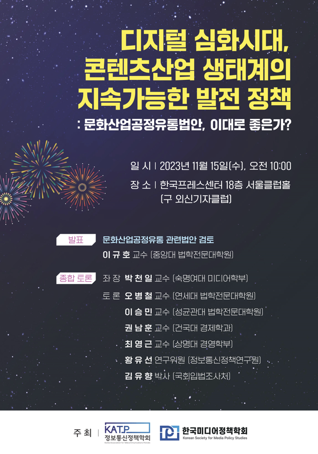 한국미디어정책학회 <디지털 심화시대, 콘텐츠산업 생태계의 지속가능한 발전 정책: 문화산업공정유통법안, 이대로 좋은가?> 세미나 개최 안내