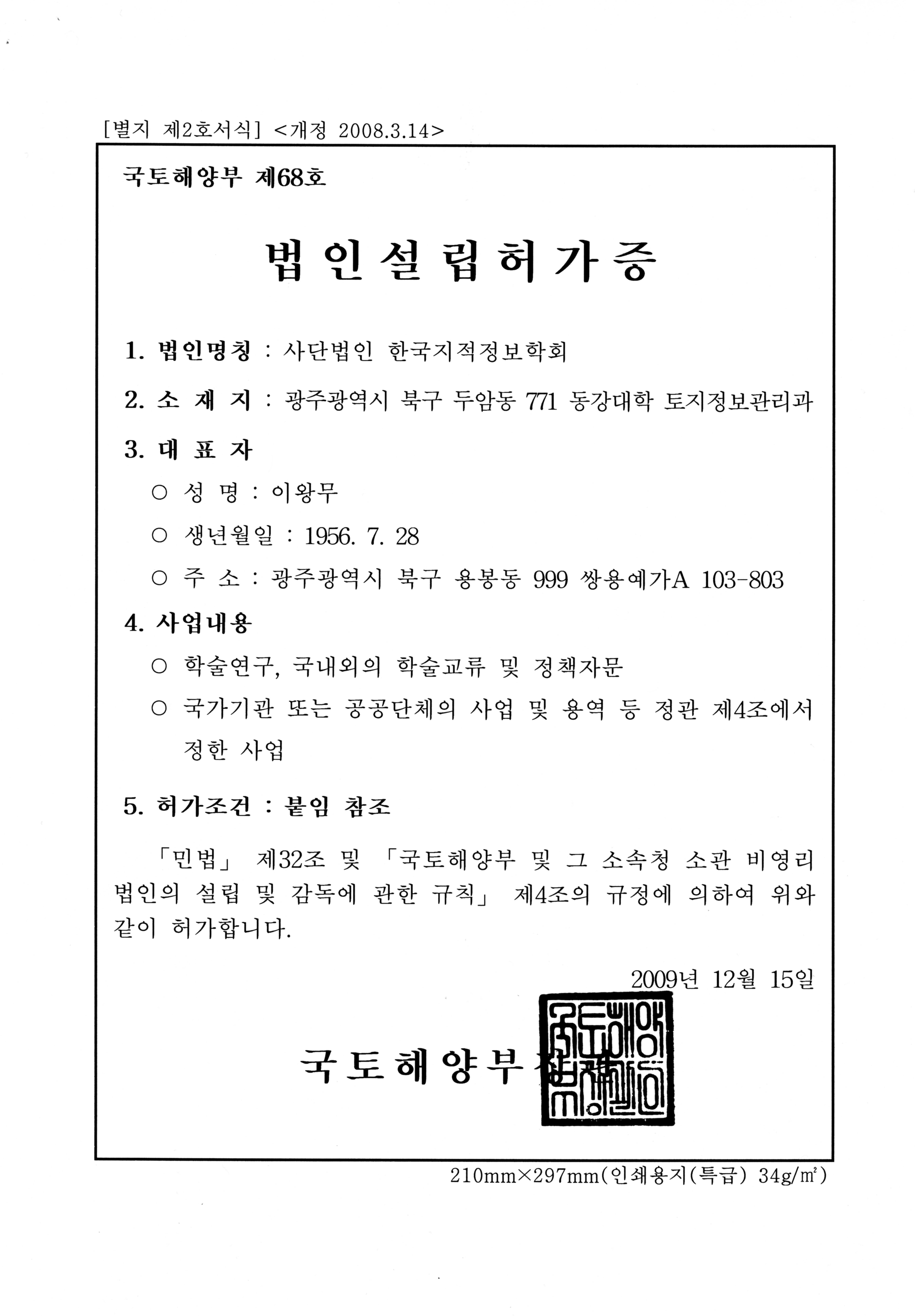 국토해양부로부터 사단법인 설립허가증을 교부받았습니다.