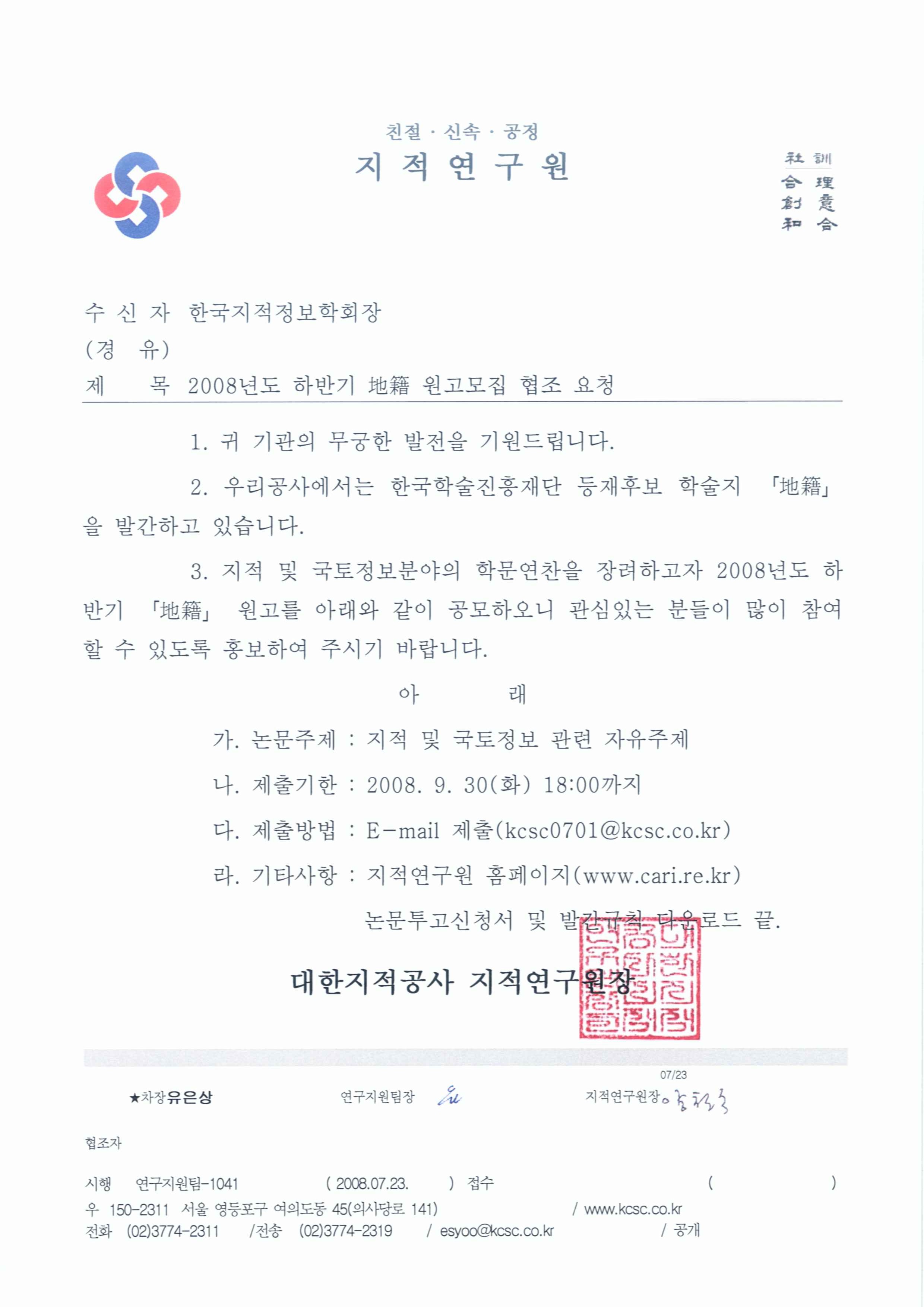 대한지적공사에서는 2008년도 하반기 『地籍』원고모집을 진행 중에 있습니다. 관심 있는 학회원님들의 많은 참여를 부탁드립니다.