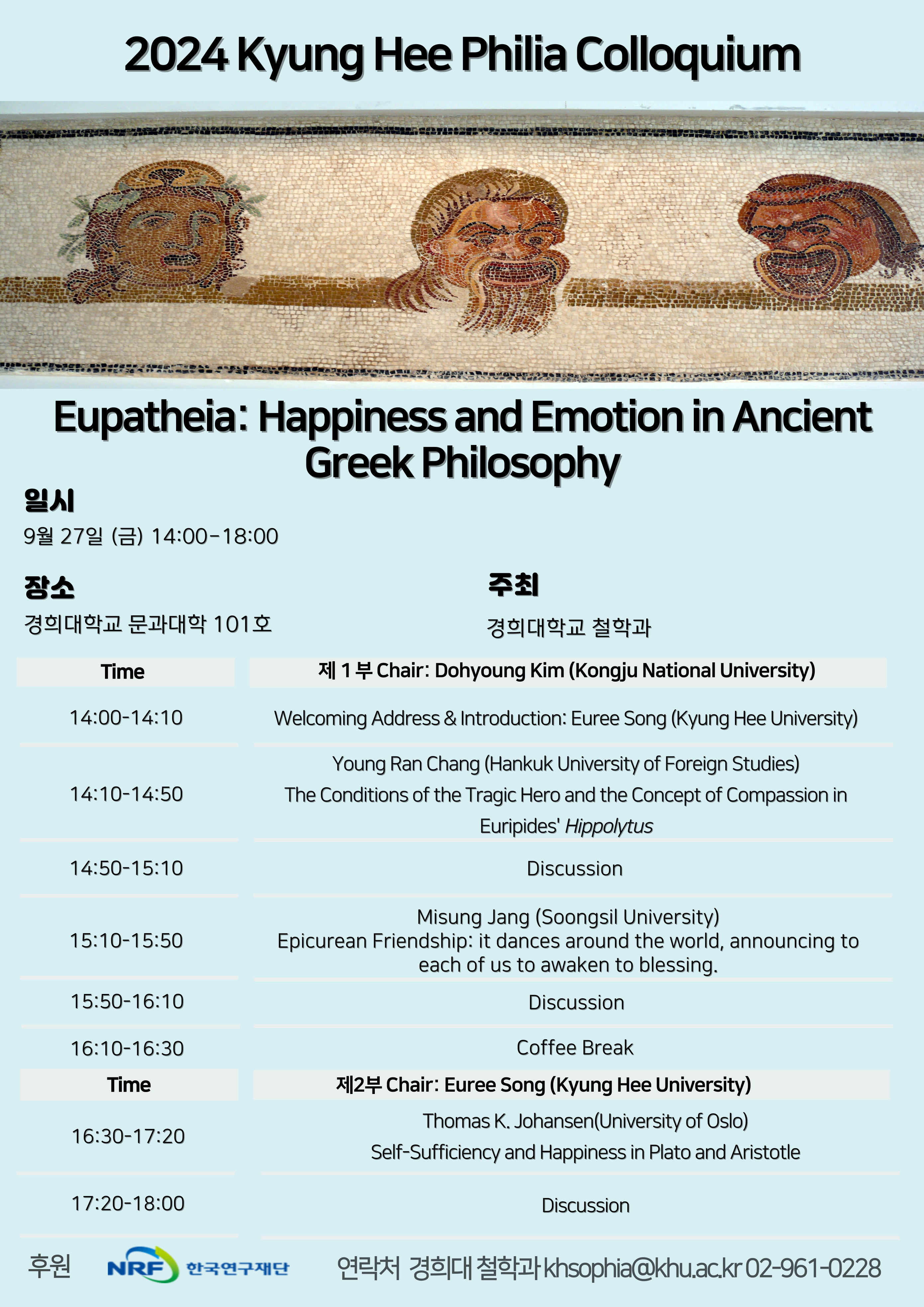 9월 25일 (수) 오후 3시부터 6시까지 플라톤과 아리스토텔레스의 영혼론에 대한 최신 연구 동향에 대한 강연 및 워크샵이 열리고, 27일 (금) 오후 2시부터 6시까지 Eupatheia: Happiness and Emotion in Ancient Philosophy라는 주제하에 한국외대 장영란 교수와 숭실대 장미성 교수, 그리고 Johansen 교수의 강연을 청해 듣는 자리를 마련했습니다. 장소는 경희대학교 문과대학 101호입니다. 자세한 사항은 포스터를 참고해 주시기 바랍니다. 이 두 행사는 한국연구재단의 국제협력프로젝트 "Eupatheia: 고대철학에서 행복과 감정의 관계" 의 지원을 받았습니다.