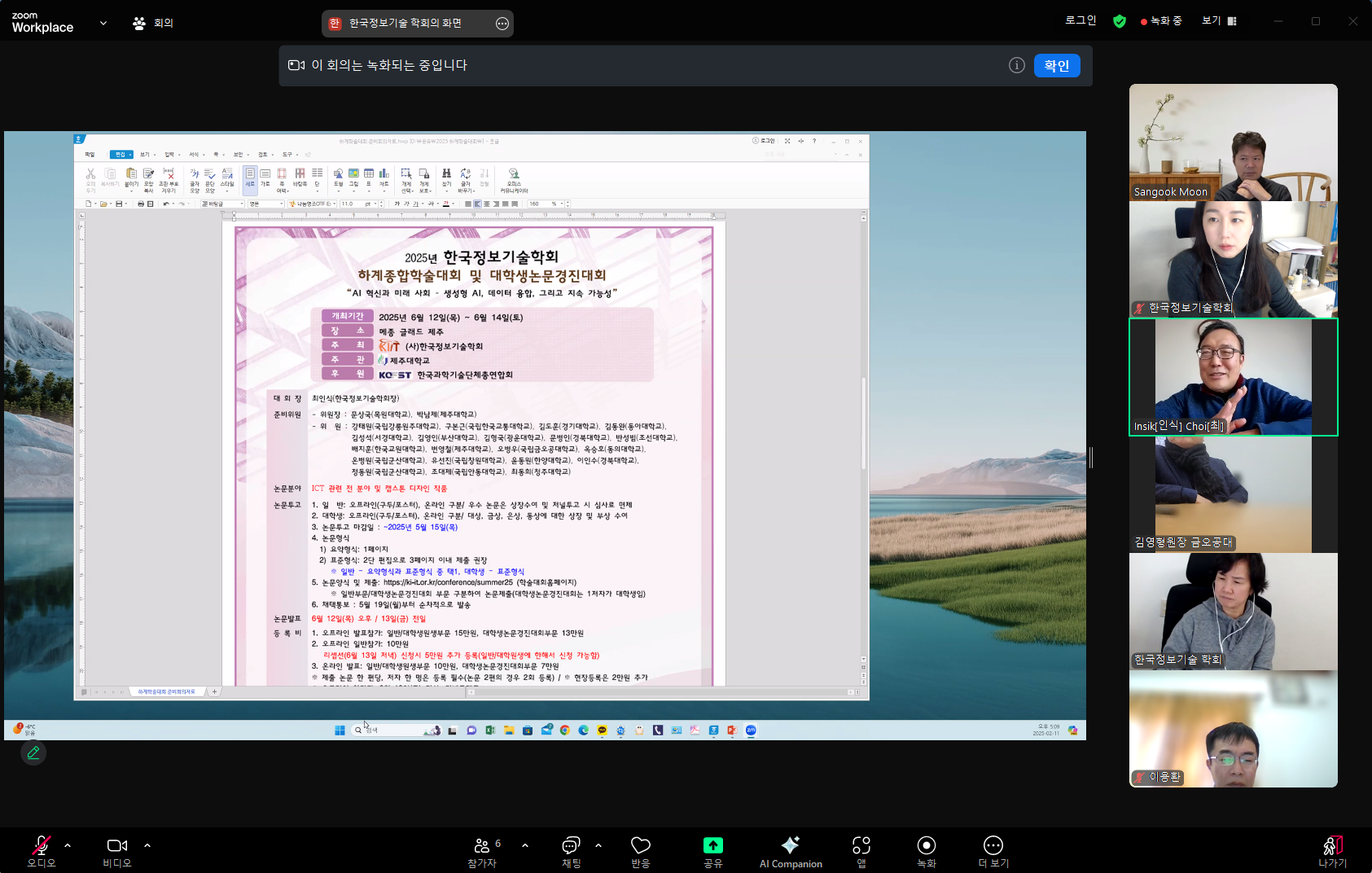 참석: 문상국 국내학술위원장, 최인식 학회장, 김영형 수석부회장, 이용환 상임의장, 사무국