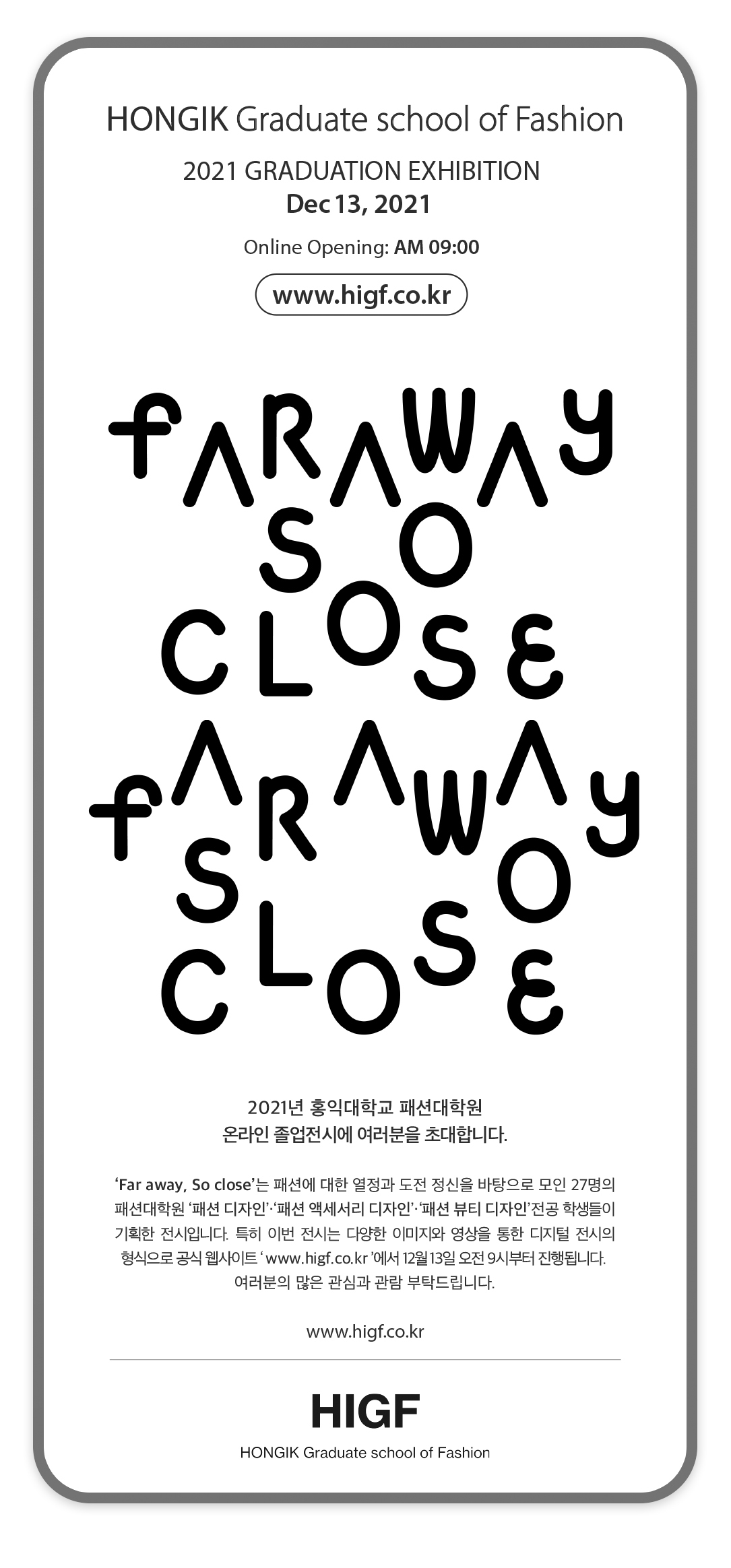 2021년 홍익대학교 패션대학원 온라인 졸업 전시 <Far away, So close>에 여러분을 초대합니다.