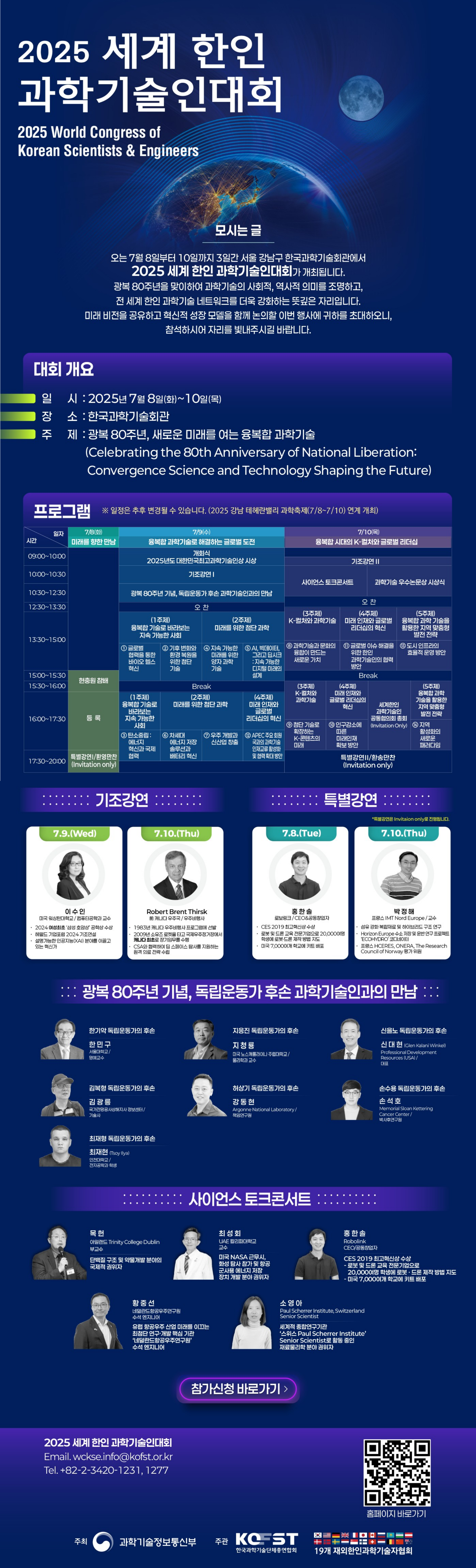 본 대회는 광복80주년을 맞이하여 과학기술의 사회적, 역사적 의미를 조명하고, 전 세계한인과학기술네트워크를 더욱 강화하는 뜻깊은 자리입니다.