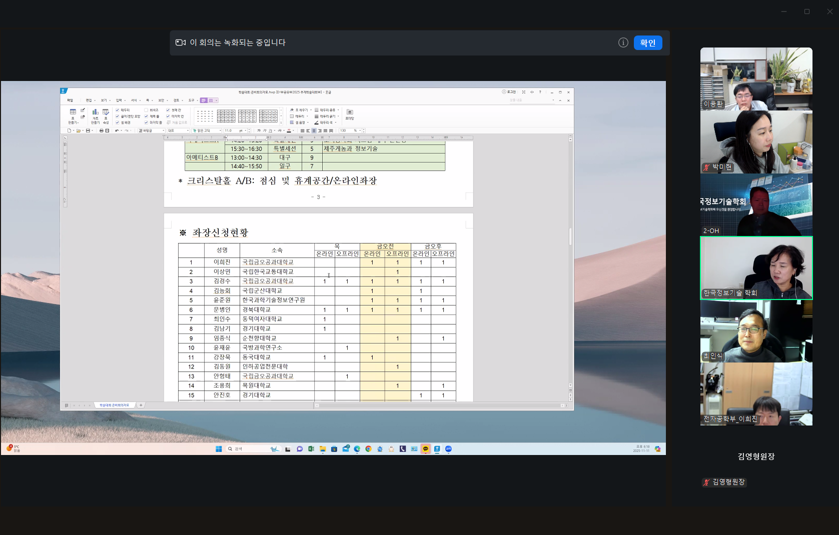 참 가 : 문상국 학술위원장, 이희진 부학술위원장, 최인식 학회장, 김영형 수석부회장, 이용환 상임이사회의장, 사무국내 용 : 2025년 추계종합학술대회 및 대학생논문경진대회 준비회의