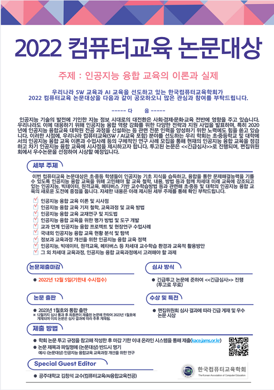 우리나라 SW교육과 AI교육을 선도하고 있는 한국컴퓨터교육학회가 2022 컴퓨터교육 논문대상의 접수기간을 12월 16까지 연장하여 다음과 같이 공무하오니 많은 관심과 참여를 부탁드립니다.
