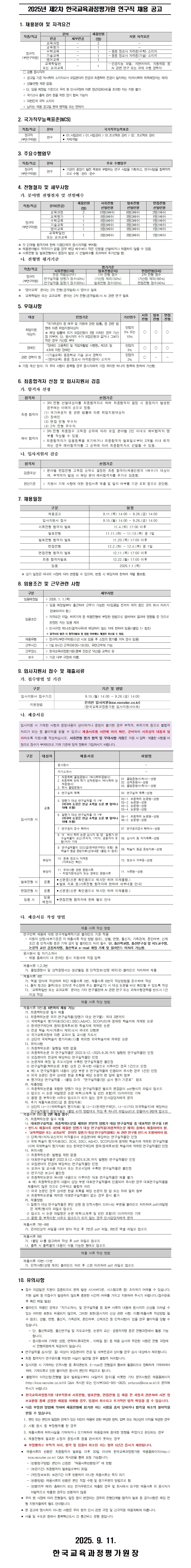 안녕하세요,한국교육과정평가원의 2025년 제 2차 연구직 신규채용 공고문을 전달드리오니 많은 관심 바랍니다.상세 내용은 한국교육과정평가원 채용 홈페이지를 참조하여 주시기 바랍니다. (https://kice.recruiter.co.kr/appsite/company/index)(문의사항: 인사부 신동현(043-931-0620))
