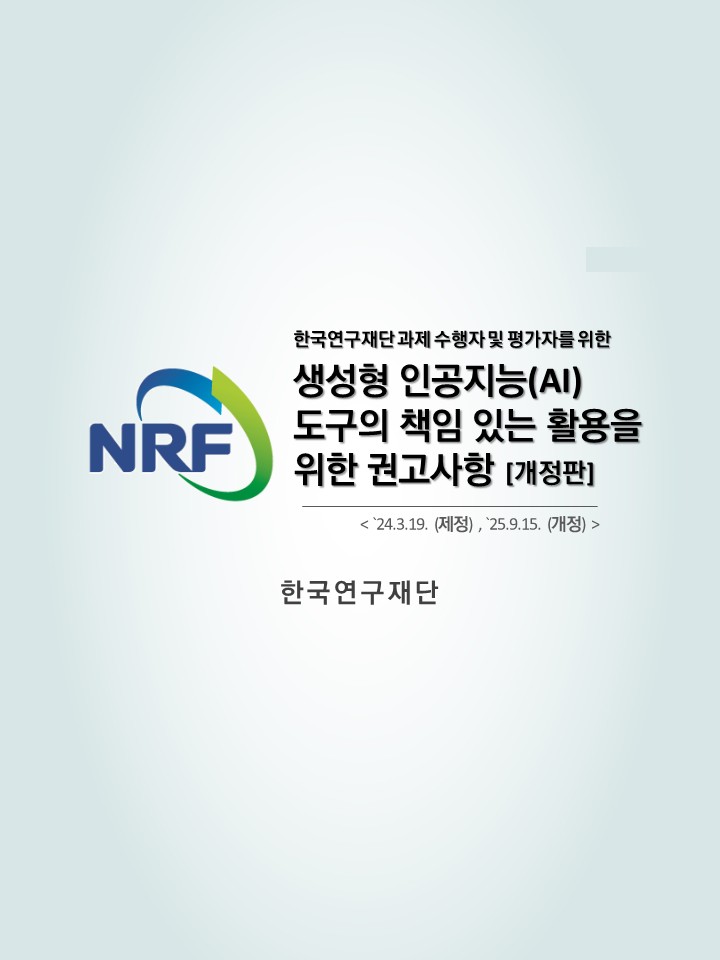 최근 연구개발과제에서 생성형 인공지능(AI) 도구의 활용이 증가함에 따라, 연구 과정에서 AI 사용의 적정성과 투명성을 확인하는 기준이 더욱 중요해지고 있습니다. 이에 학회는 회원 및 연구자 여러분께서 참고하실 수 있도록 한국연구재단에서 발간한 「생성형 인공지능(AI) 도구의 책임 있는 사용을 위한 권고사항(개정판)」을 공유드립니다.