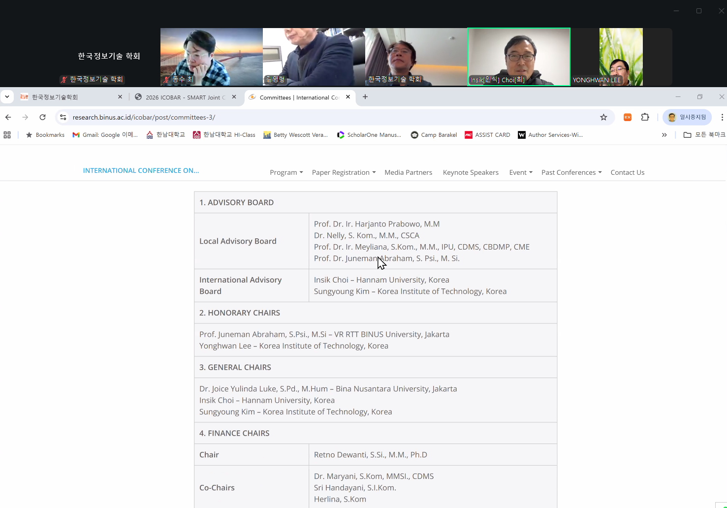 참석자: 김성영 국제학술위원장, 최동수 국제학술부위원장, 최인식 학회장, 이용환 상임이사회의장, 김영형 수석부회장