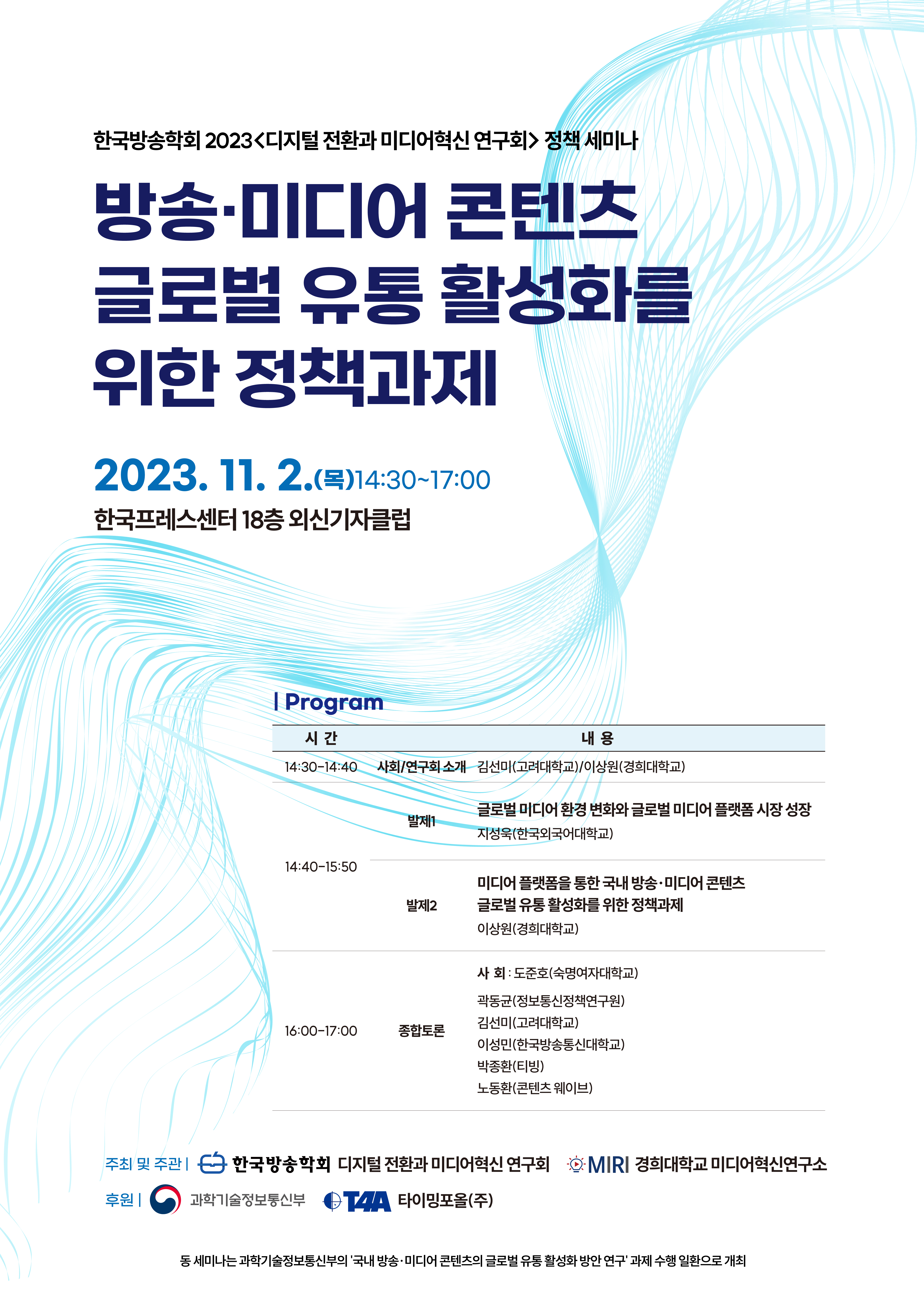 주최 및 주관한국방송학회 디지털 전환과 미디어혁신 연구회경희대학교 미디어혁신연구소(MIRI)