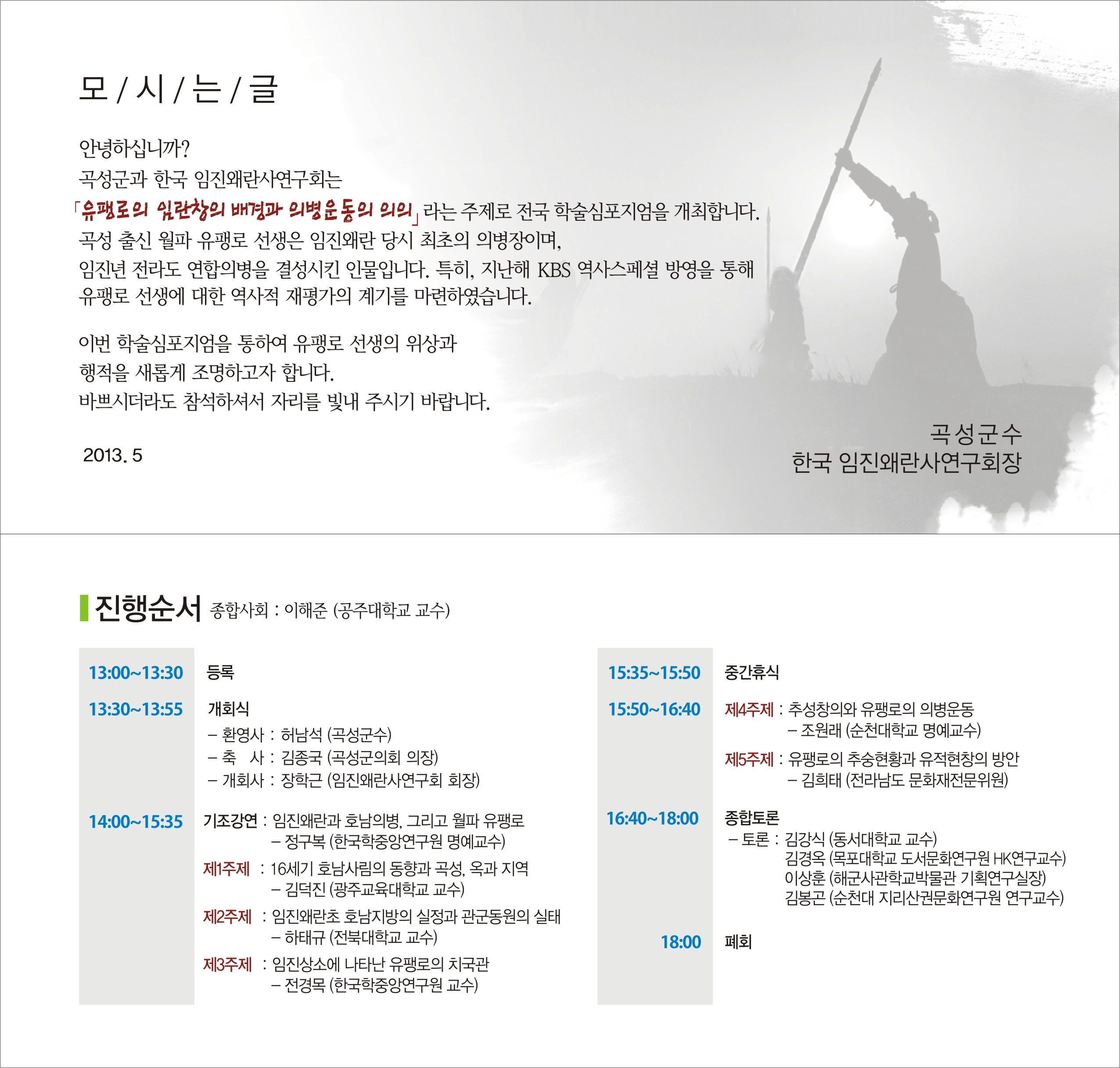 전라남도 곡성군청 주최 학술심포지엄 : 유팽로의 임란창의 배경과 의병운동의 의의 안내