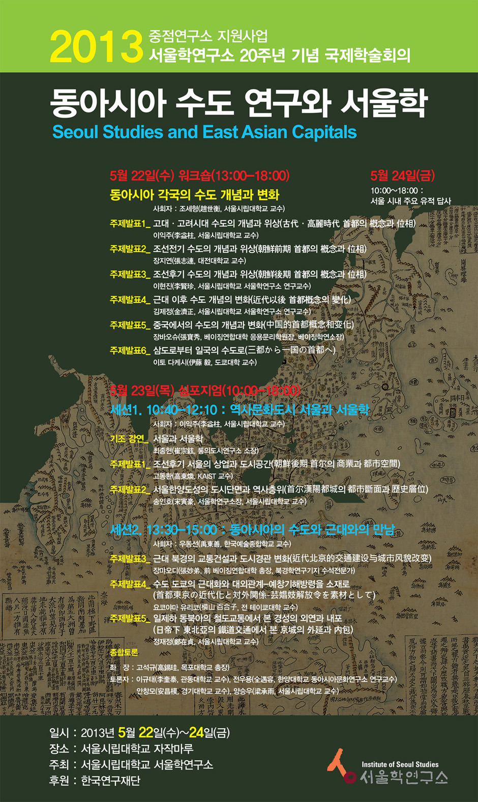 첫째 날인 5월 22일(수)에는 「동아시아 각국의 수도 개념과 변화」를 주제로 워크숍을 개최하고 둘째 날인 5월 23일(목)에는 [세션_1: 역사문화도시 서울과 서울학, 세션2: 동아시아의 수도와 근대와의 만남]이라는 주제로국제심포지엄을 개최할 예정입니다. 관심있으신 분들의 많은 참여부탁드립니다.