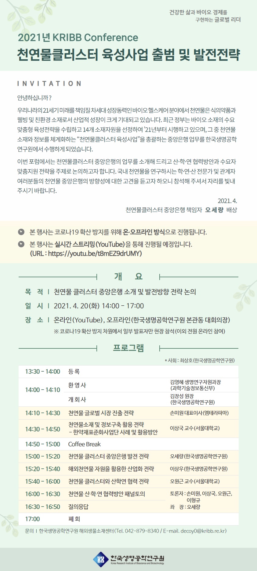 ○ 장 소 : 온라인 (YouTube), 오프라인 (한국생명공학연구원 대회의실)