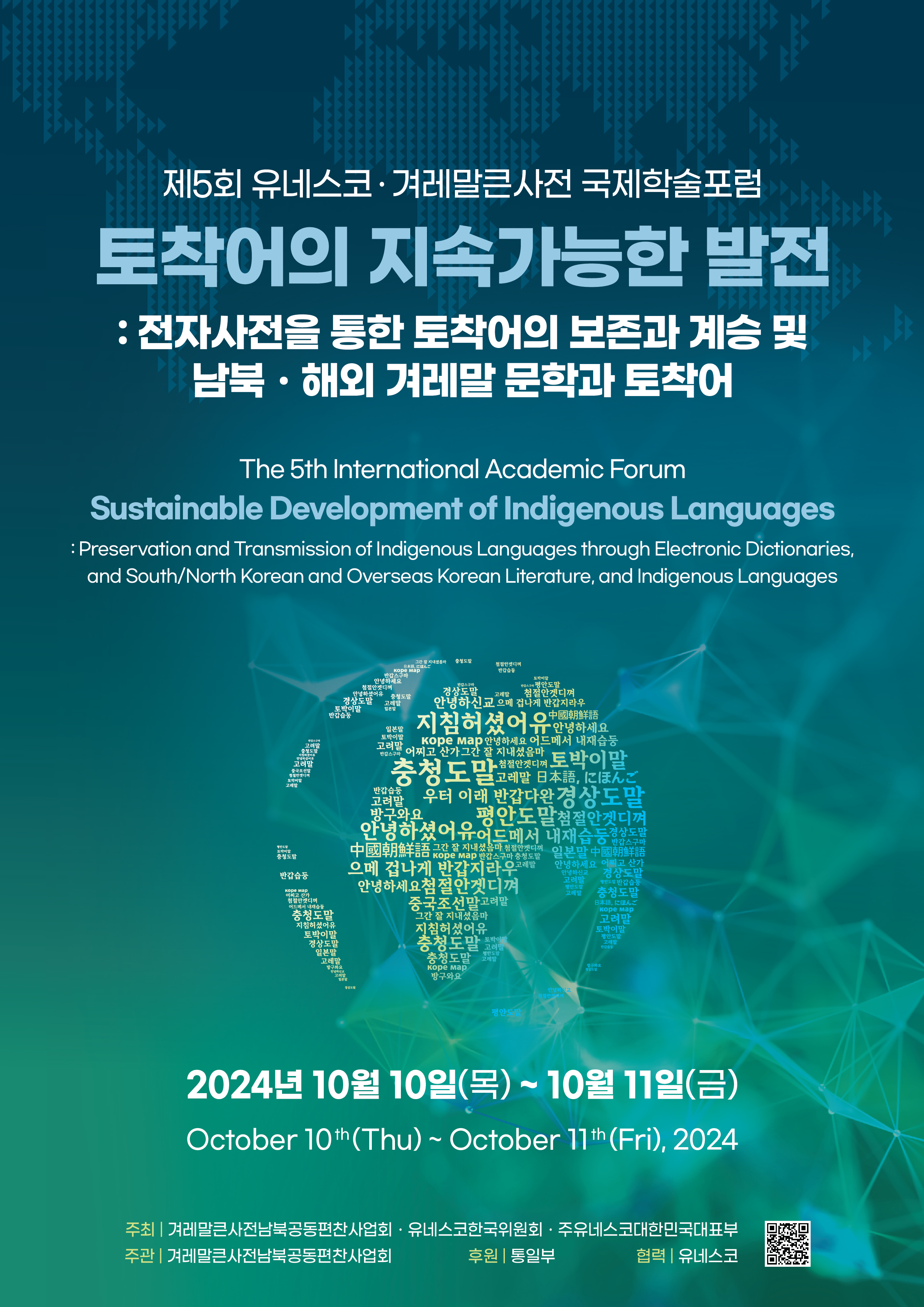 남북 공동으로 겨레말큰사전》 편찬을 추진하고 있는 겨레말큰사전남북공동편찬사업회(이사장 민현식)에서 한글날을 맞아 제5회 유네스코·겨레말큰사전 국제학술포럼 <토착어의 지속가능한 발전>을 개최합니다학회원 여러분의 많은 참여를 부탁드립니다.
